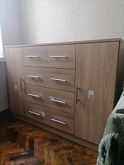 Комод понравился. Собирал сам. Очень приятно, когда крепежа хватает, все технологические отверстия на своих местах. ( кроме пары лишних отверстий на одном из фасадов, но они внутри были и я их заклеил) Может кому то будет полезно - так выглядит комод размером 130х38х87см , венге цава и ясень шимо светлый.