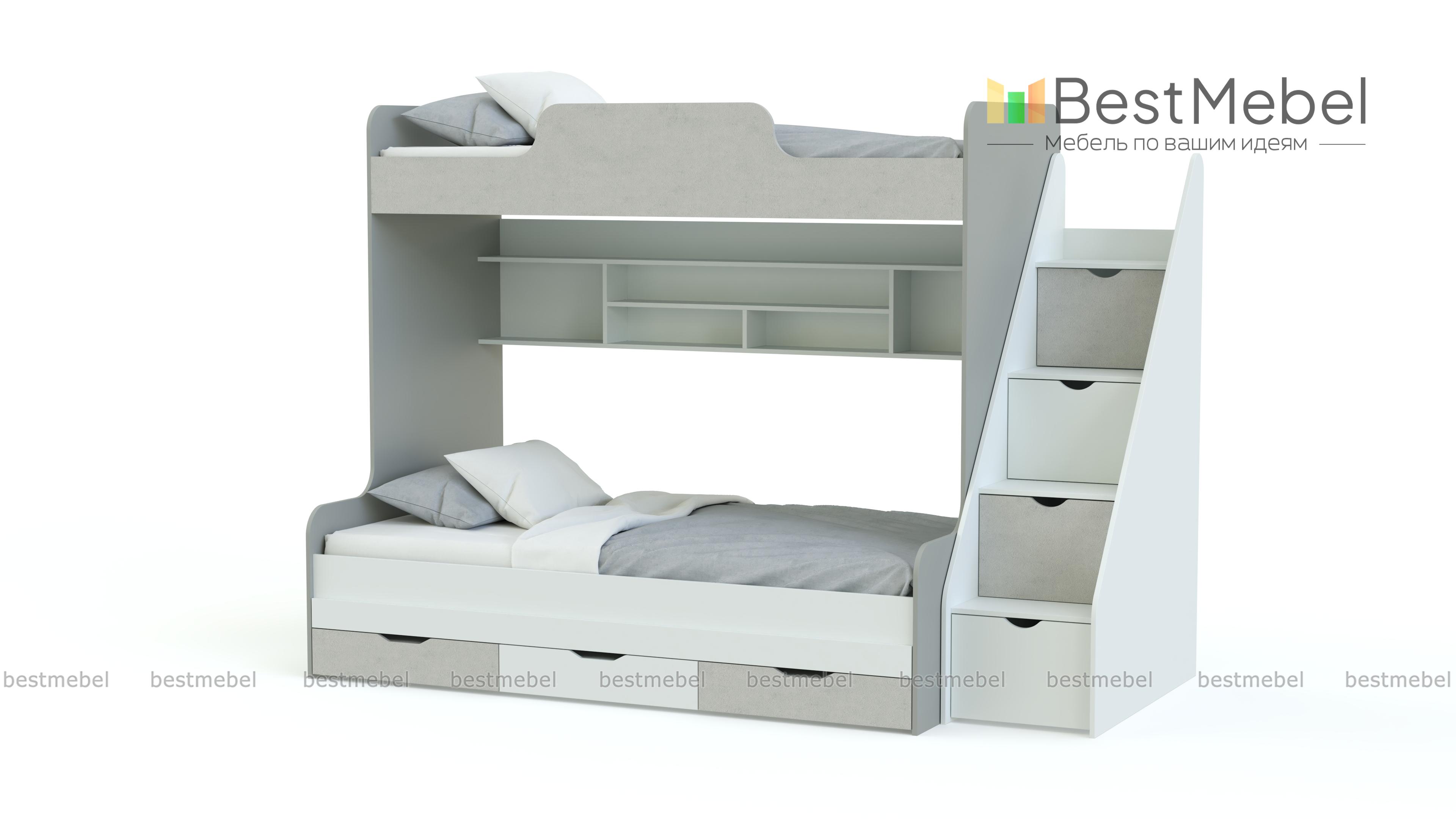 Детская двухъярусная кровать ДМ-166 BMS – продуманный вариант для комнаты, где несколько владельцев. Удобная зона отдыха организована с помощью ярусного размещения постелей (верхняя с бортиками, габариты 80 х 190 см). Задняя стенка включает многосекционную полку для книг, игрушек, личных вещей. В нижней кроватке (120 х 190 см) есть ящики. Лестница оборудована ступенями с отсеками под хранение. Композиция занимает в длину 240 см. Основной материал – ЛДСП, кромка ПВХ. Интересные детали дизайна, цветовая гамма в нескольких комбинациях.