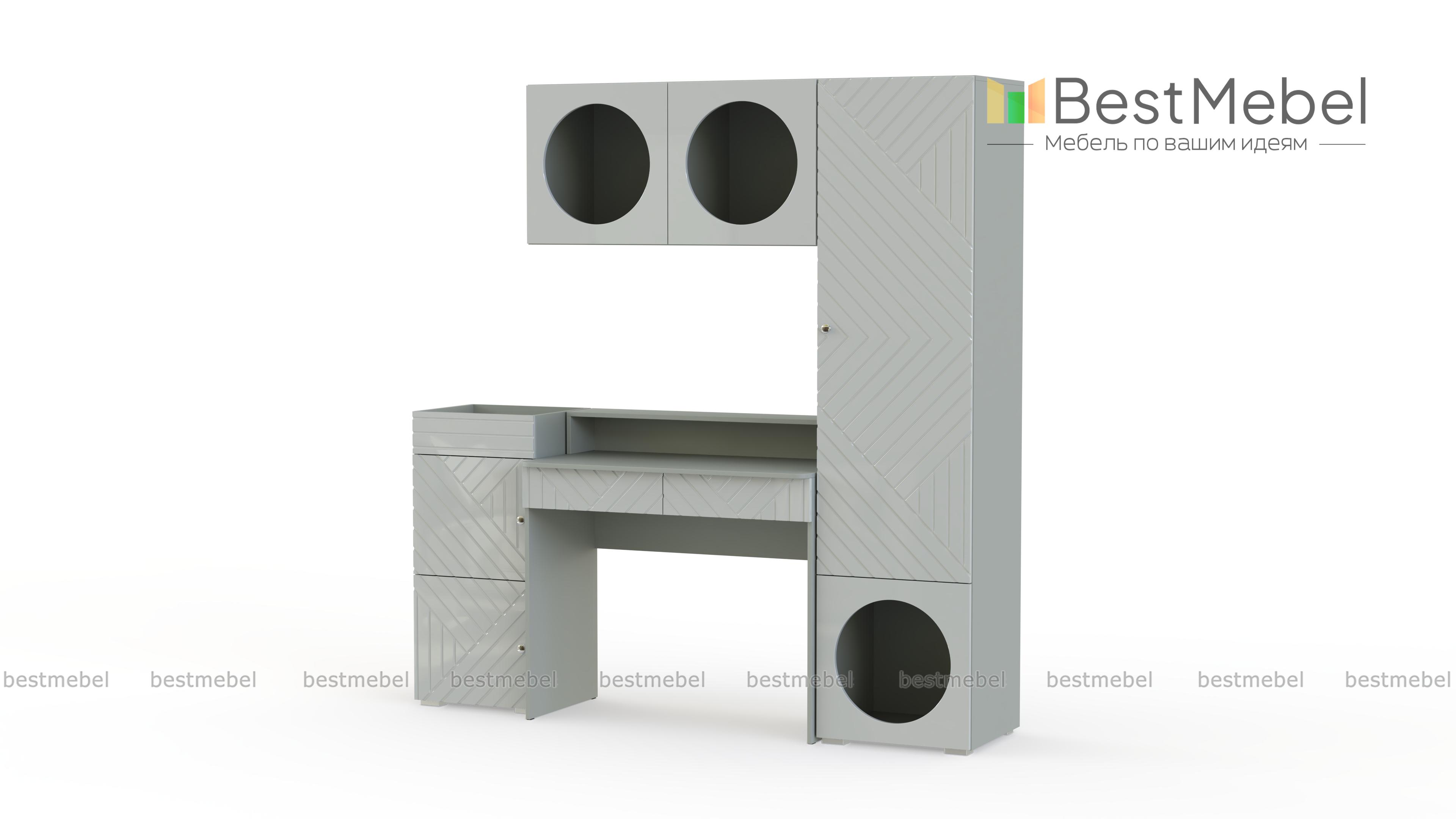 Детская стенка Авелин 6 BMS — это готовая рабочая зона с удобной системой хранения. Компактный столик с нишей дополняют два ящика для канцелярских мелочей и приставная тумба, а для книг, учебных пособий и личных вещей ребенка предусмотрены пенал и подвесная полка. Оригинальный дизайн с фрезерованными линиями и круглыми полками отражает модные тренды. Купить детскую стенку Авелин 6 BMS с возможностью выбора цвета и размеров приглашаем в наш интернет-магазин.