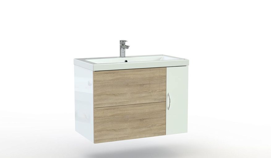 Тумба в ванную комнату Клео 7 BMS – это широкая и вместительная, но при этом не громоздкая благодаря подвесной конструкции модель. Вы сможете не только эстетично вписать в современный интерьер раковину и скрыть коммуникации, но и хранить под рукой гигиенические принадлежности, бытовую химию и хозяйственные мелочи. Выполненная в актуальном сочетании древесных тонов и белого, тумба оборудована двумя выдвижными ящиками и распашным отделением. Купить тумбу в ванную комнату Клео 7 BMS приглашаем в наш интернет-магазин.