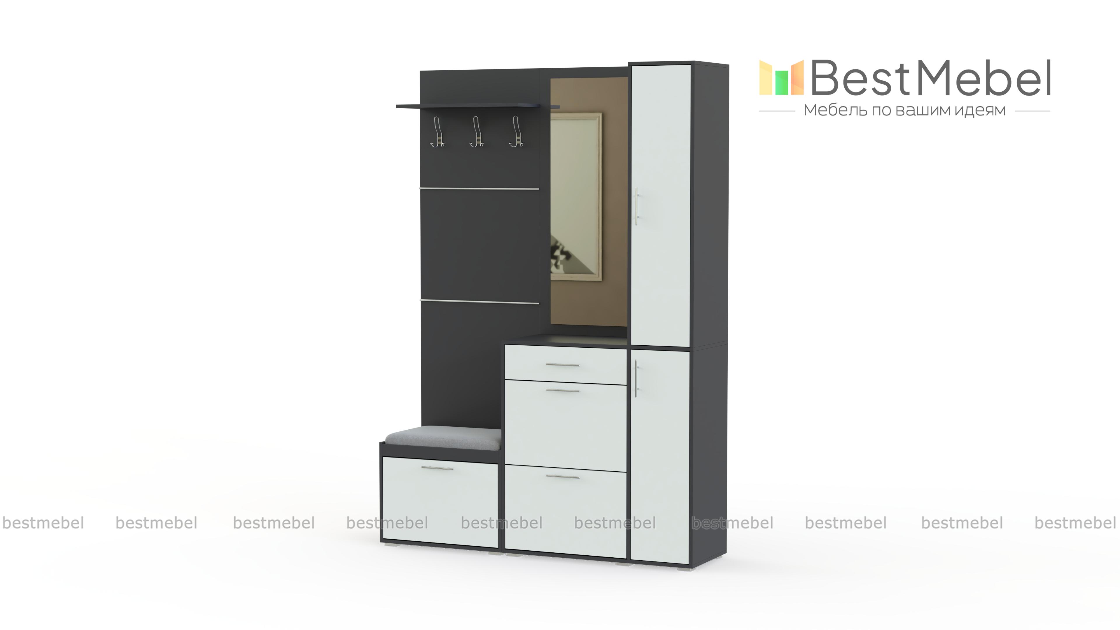 Прихожая Талисма BMS -практичный вариант для любителей все раскладывать по своим местам. Шкафчики расположены ступеньками. Самая низкая обувница с одним отделением имеет мягкую крышку, она заменяет пуфик, незаменимая помощница при обувании. Высокая тумба способна вместить минимум 8 пар обуви, кроме того у неё предусмотрен выдвижной ящик для мелочей и отделение с полками. На вешалке с крючками разместится сезонная одежда и головные уборы. Зеркальная панель дополнена шкафчиком, она универсальна и может быть собрана в зеркальном отражении. Купить прихожую Талисма BMS по низкой цене можно на нашем официальном сайте.