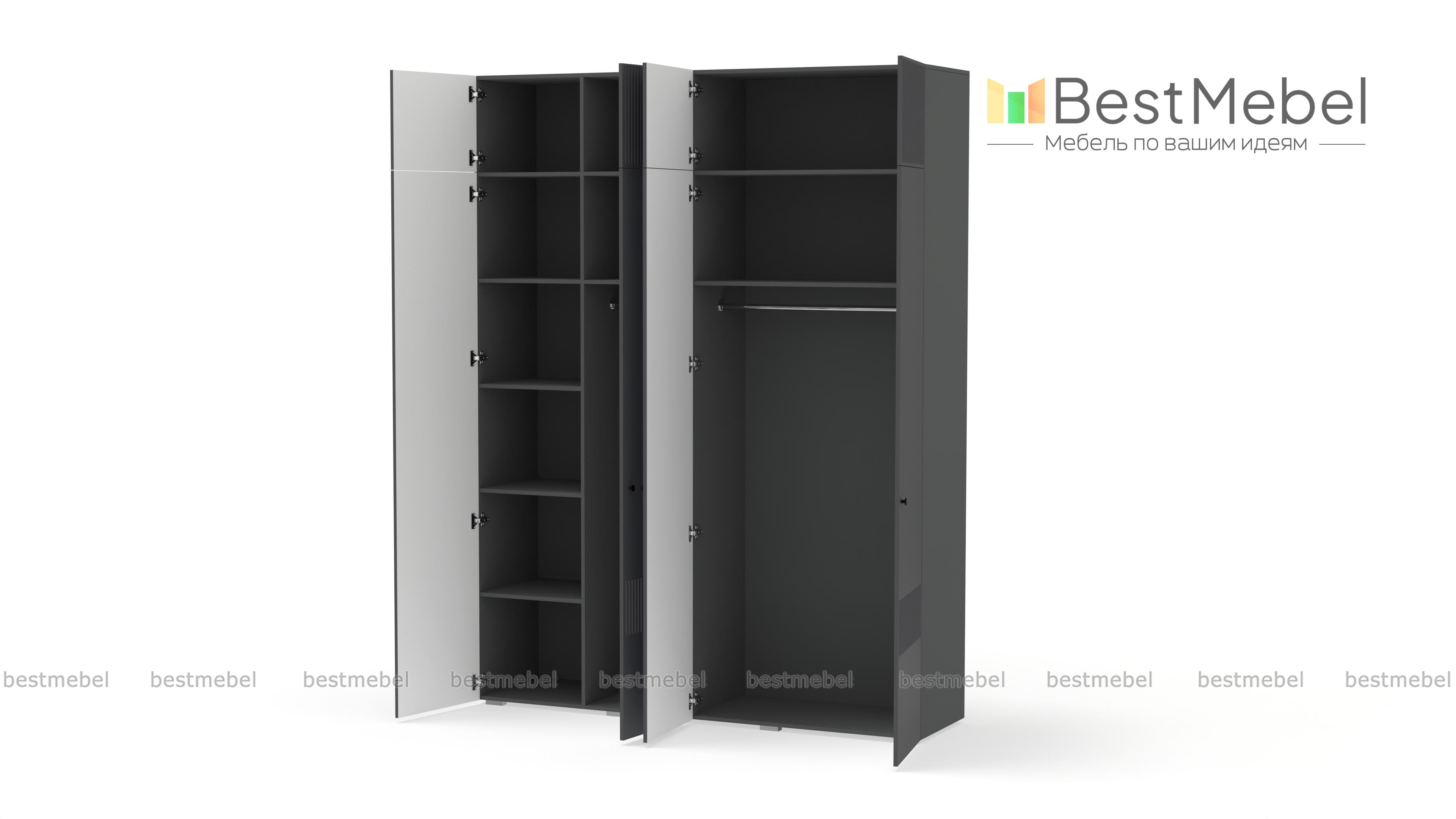 Шкаф распашной Джосс 10 BMS с четырьмя дверцами и антресолью можно разместить в разных комнатах: небольших спальнях, прихожих и детских. Оригинальные оттенки корпуса и фасада создают комфортную атмосферу в помещении, стильный акцент в отделке — фрезерованный орнамент. За дверцами справа скрыты штанга и полка, а слева — узкая платяная секция и бельевой стеллаж. Купить шкаф распашной Джосс 10 BMS с выбором размеров, цвета и фурнитуры вы сможете недорого в нашем интернет-магазине.