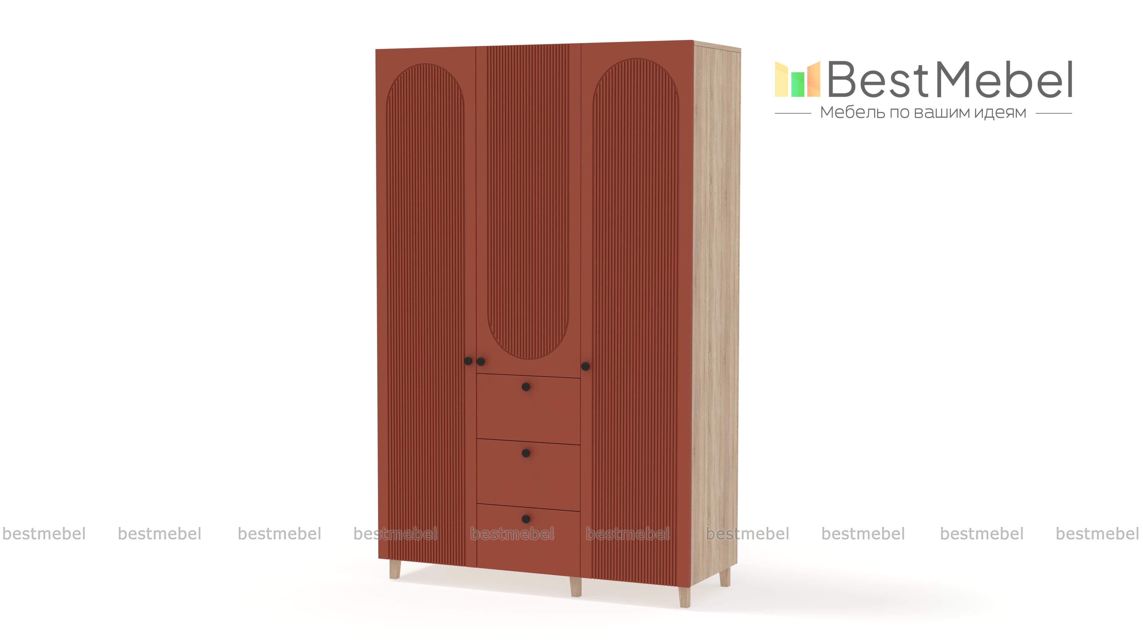 Шкаф распашной Рене 22 BMS с высокими ножками прекрасно подходит для меблировки спален, прихожих и гостиных. Помимо распашных отделений для белья и одежды трехдверный шкаф оборудован рядом из трех выдвижных ящиков, предназначенных для мелочей. На стильном темном фасаде из МДФ — оригинальный рельеф и миниатюрные круглые ручки. Купить шкаф распашной Рене 22 BMS в оттенках из нашего каталога и необходимом размере вы сможете недорого на сайте интернет-магазина.