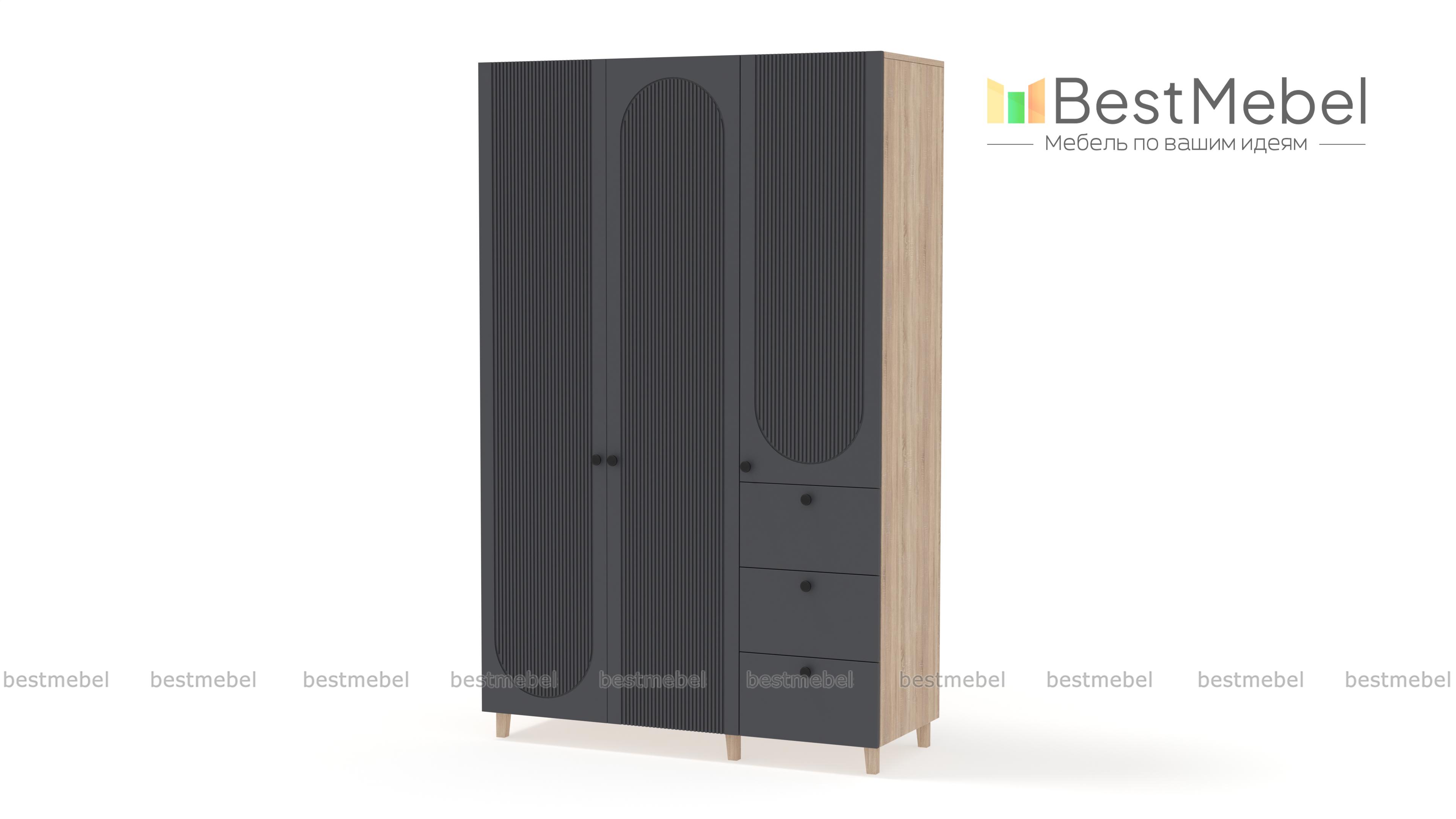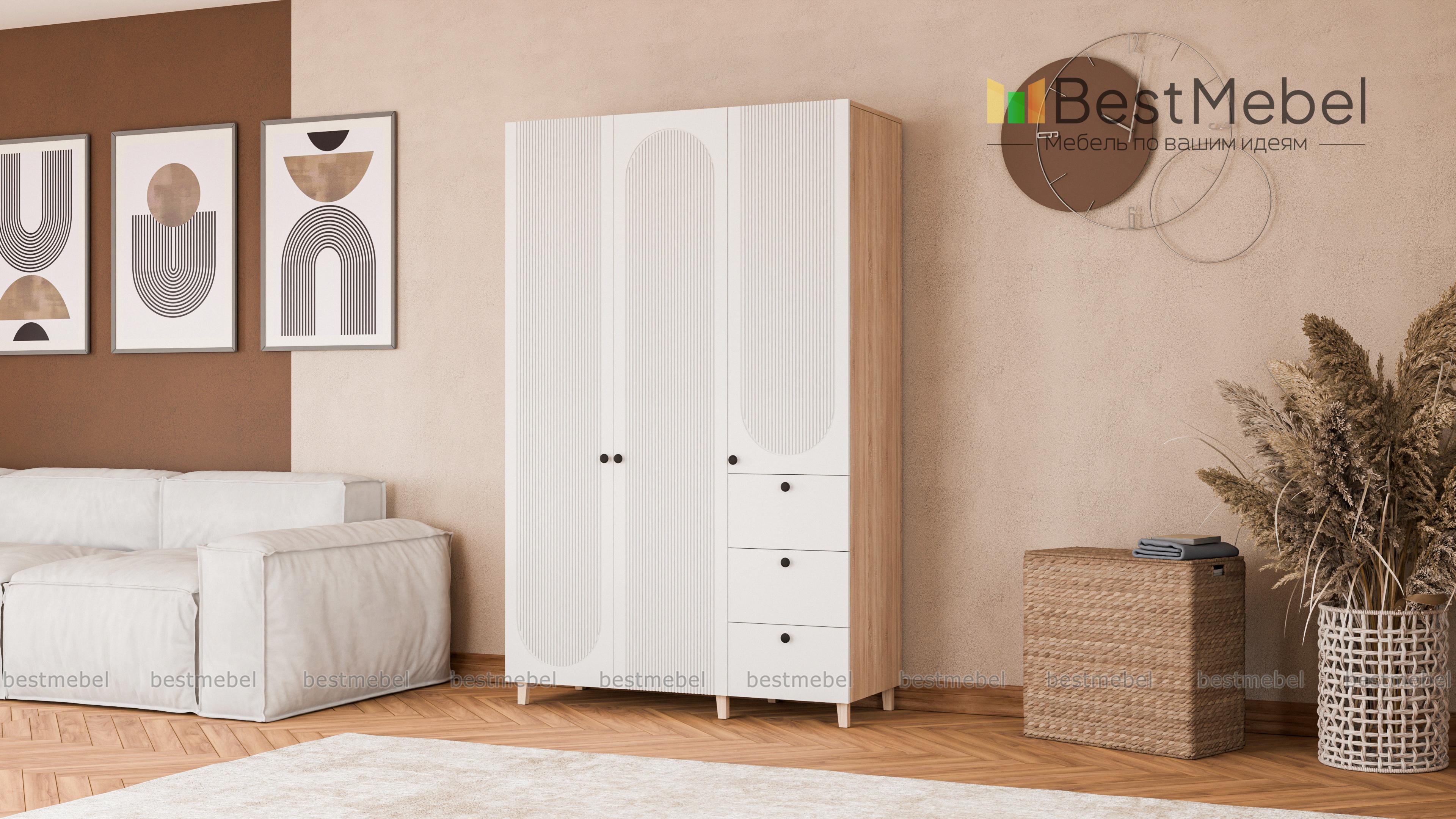Шкаф распашной Рене 24 BMS удобен тем, что позволяет хранить не только вещи на вешалках, но и мелкий трикотаж, аксессуары, постельное белье. Двухдверное платяное отделение дополнили комбинированным пеналом с тремя выдвижными ящиками снизу. Цветной фасад шкафа украшает стильный геометричный рельеф, для легкости конструкции — высокие деревянные ножки. Купить шкаф распашной Рене 24 BMS вы сможете в нашем интернет-магазине, подобрав размеры и наиболее походящую цветовую гамму.