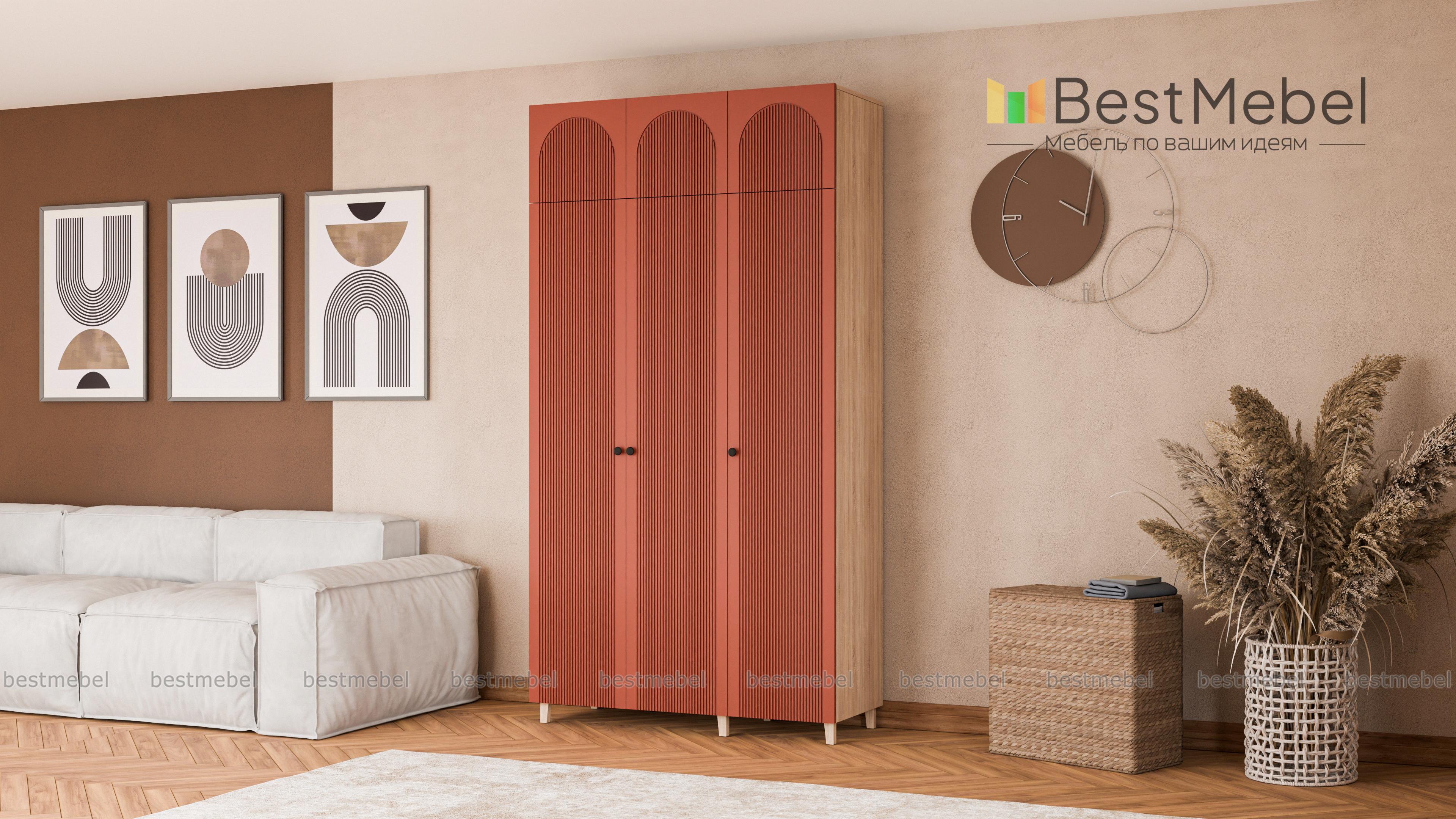 Шкаф распашной Рене 25 BMS сделает хранение в спальне, детской или прихожей удобным и эстетичным. Все предметы гардероба и постельные принадлежности будут скрыты за изящным фасадом с арочными вырезами и рельефом. Корпус и фасад выполнены из ламинированной ДСП и МДФ светлого оттенка, а дополнительную легкость высокому трехдверному шкафу с антресолью придают деревянные ножки. Купить шкаф распашной Рене 25 BMS вы всегда сможете в нашем интернет-магазине, по желанию изменив цвет и размеры.