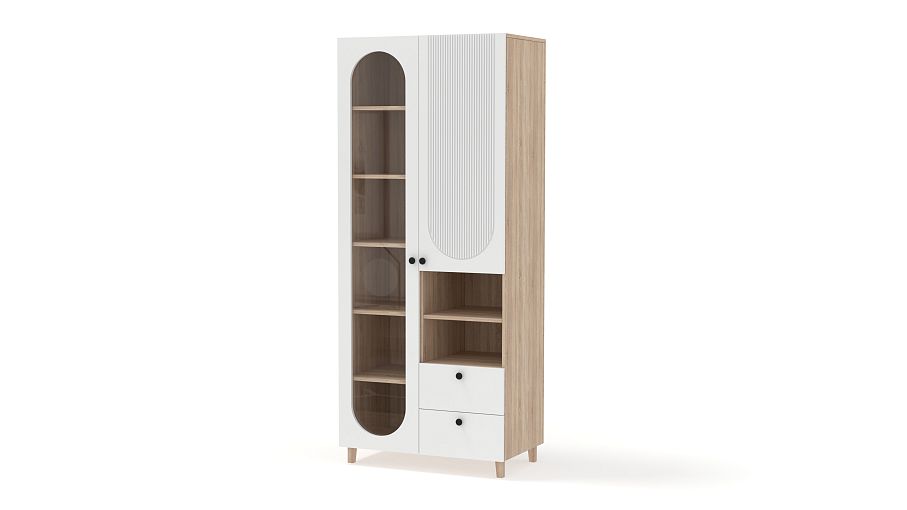 Шкаф распашной Рене 6 BMS с фактурным фасадом органично вписывается в пространство современной квартиры. Лаконичный силуэт с высокими ножками сочетается с оригинальным геометричным декором. Овальный вырез витрины слева дополняет закрытое отделение справа, секция с полкой для открытого хранения и два вместительных выдвижных ящика под мелкие вещи. Купить шкаф распашной Рене 6 BMS вы сможете в нашем интернет-магазине, подобрав размеры, цвет и фурнитуру.