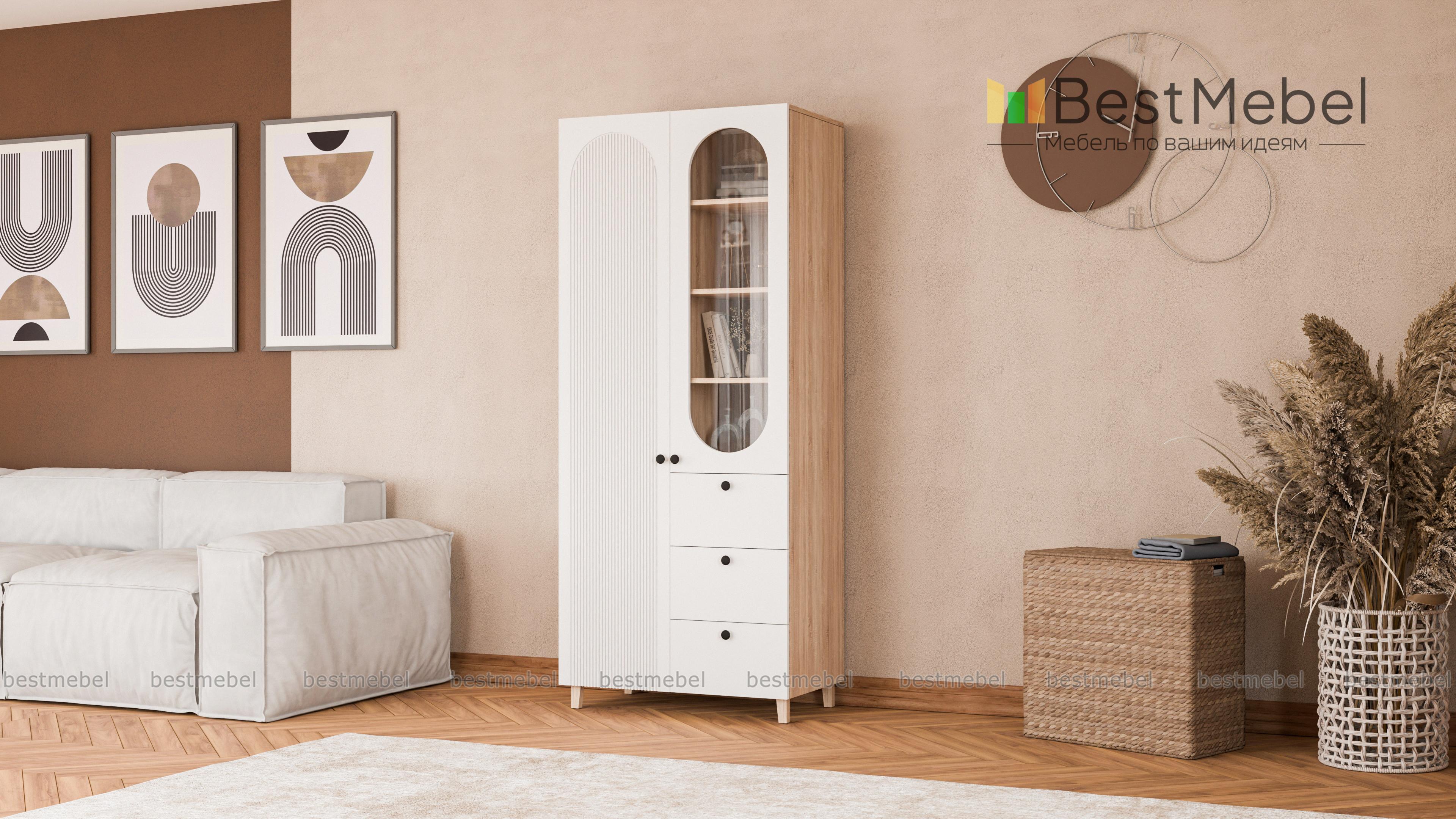 Шкаф распашной Рене 8 BMS при своих скромных размерах учитывает самые разные потребности в хранении. Для одежды, книг, важных мелочей и декора предусмотрены закрытое отделение слева, витрина и три выдвижных ящика. Гармонично смотрится сочетание светлой отделки с деревянными ножками, а овальные вырезы и фрезеровка придают этой современной модели элегантность классики. Купить шкаф распашной Рене 8 BMS вы сможете в нашем интернет-магазине, по желанию изменив цвет и размеры.