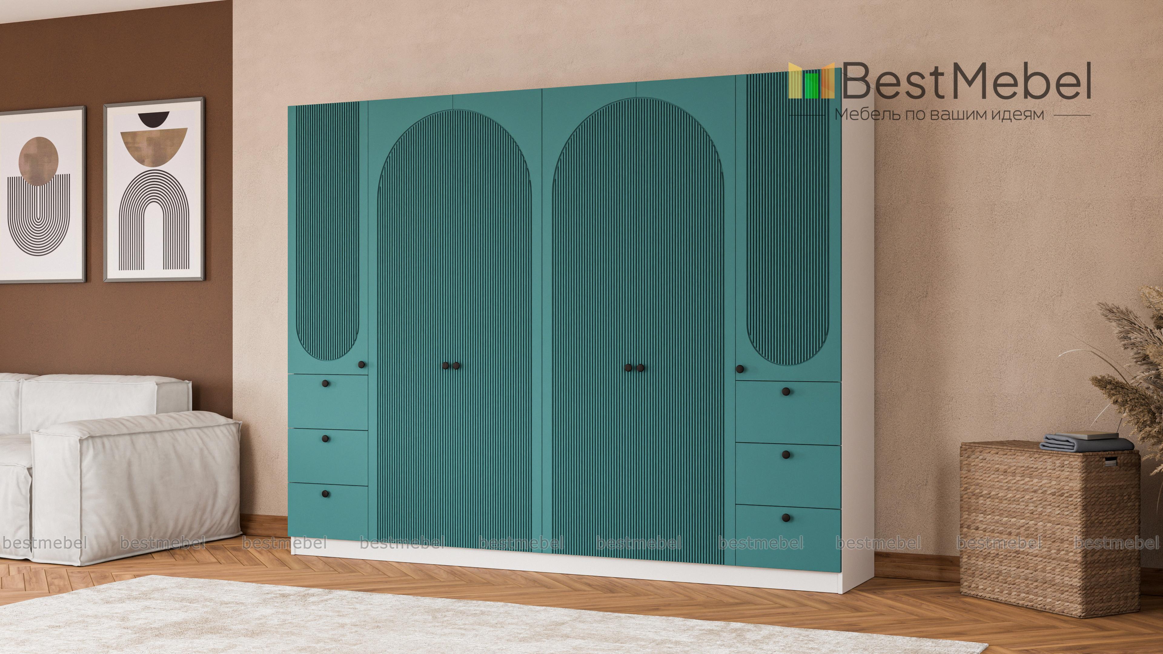 Шкаф распашной Вивьен 19 BMS с двумя платяными отделениями и двумя комбинированными легко и удобно разместит семейный гардероб. Габаритная конструкция для просторной спальни или прихожей оборудована штангами, бельевыми полками и шестью выдвижными ящиками. На фасаде из МДФ актуального оттенка — оригинальная геометричная фрезеровка и контрастные круглые ручки. Купить шкаф распашной Вивьен 19 BMS с изготовлением по индивидуальным размерам вы сможете на сайте нашего интернет-магазина.