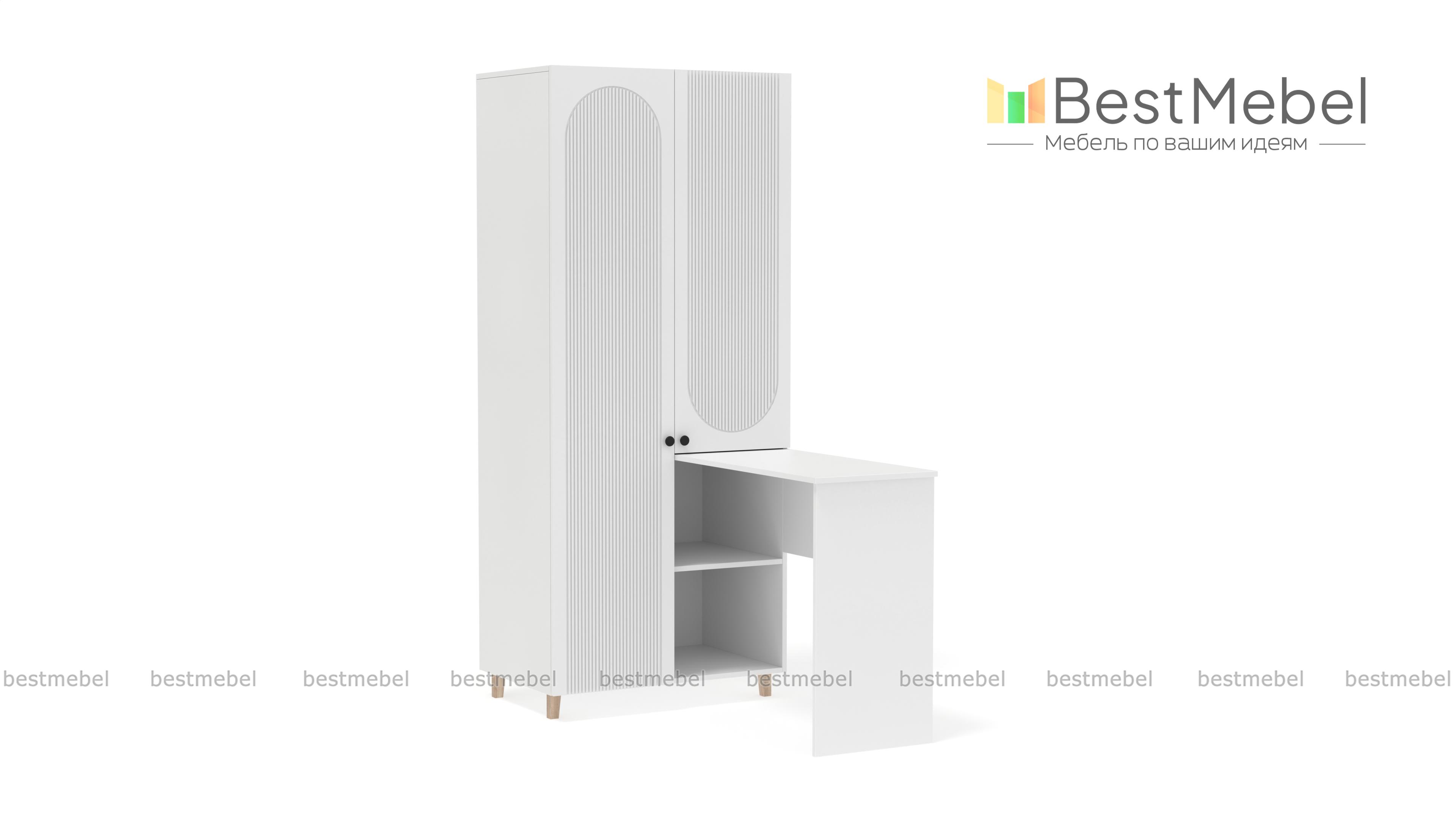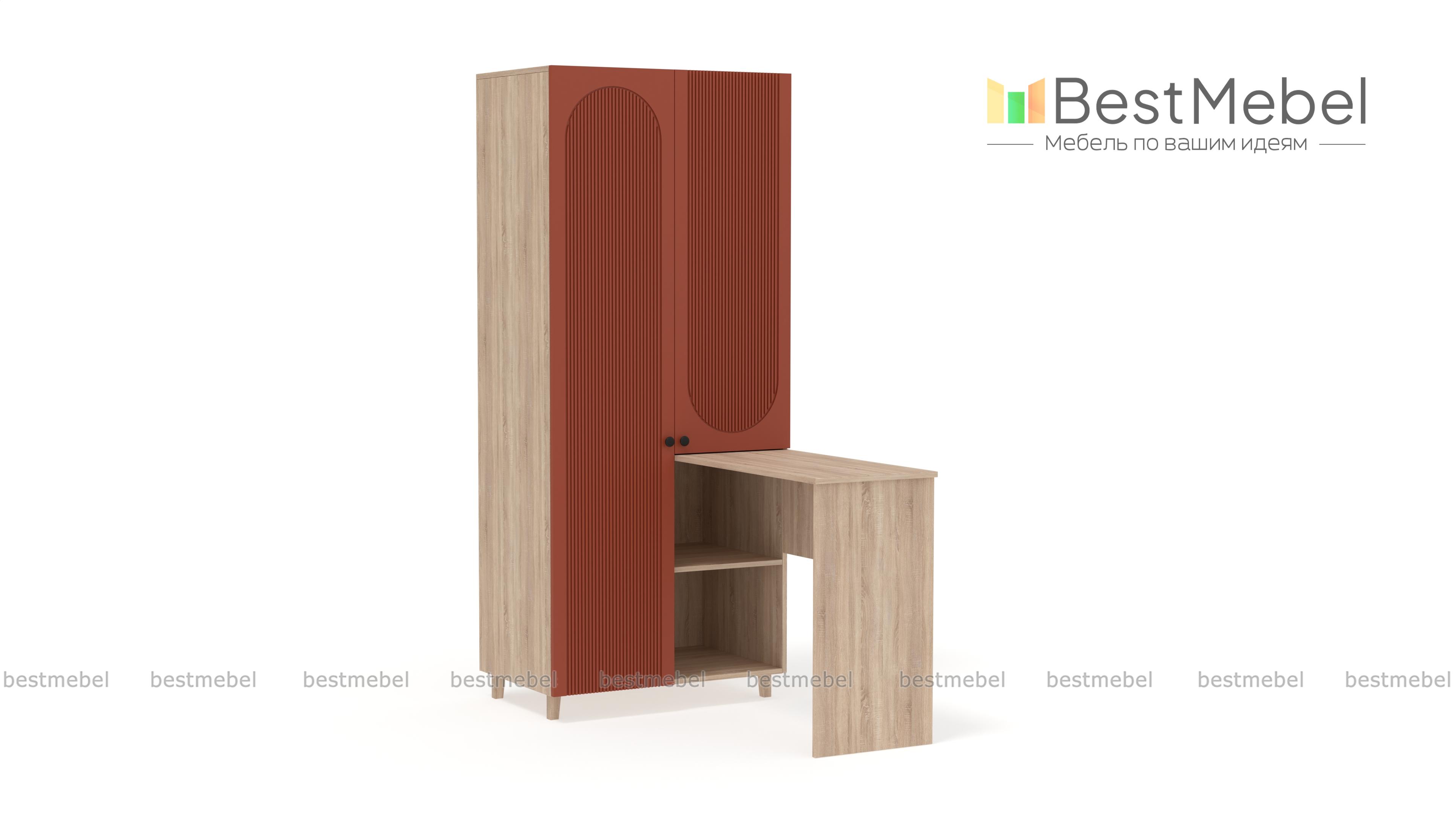 Шкаф со столом Рене 5 BMS обеспечит значительную экономию пространства в небольшой квартире или студии. Конструкция с распашными отделениями и открытыми полками позволяет разместить как одежду, так и материалы для работы или учебы. Письменный столик прямоугольной формы располагается под углом к стильному двухдверному шкафу с рельефным фасадом. Купить шкаф со столом Рене 5 BMS вы сможете на сайте нашего интернет-магазина с изготовлением по индивидуальным размерам.