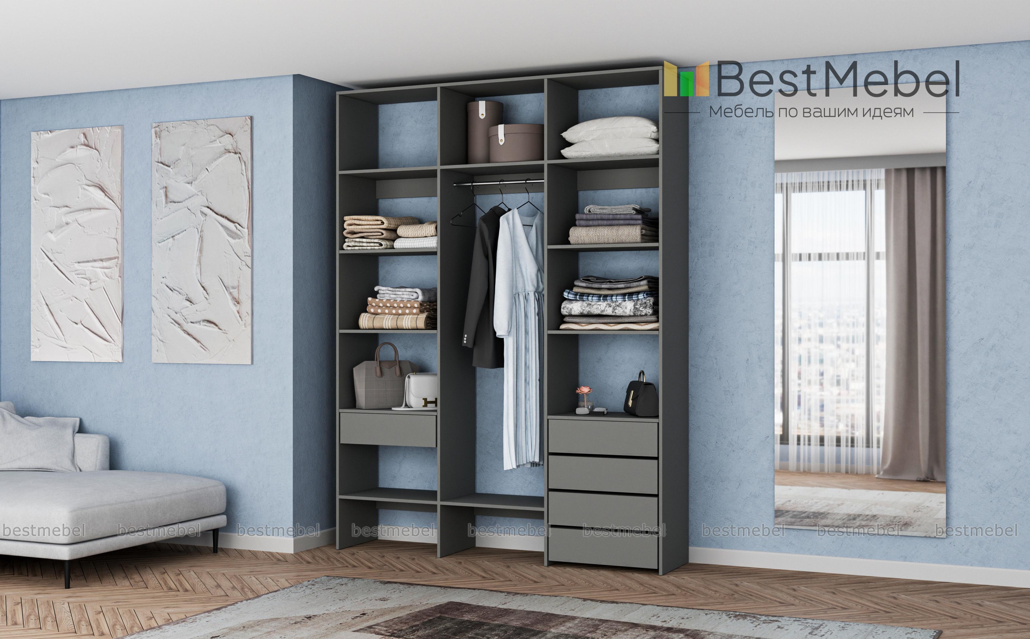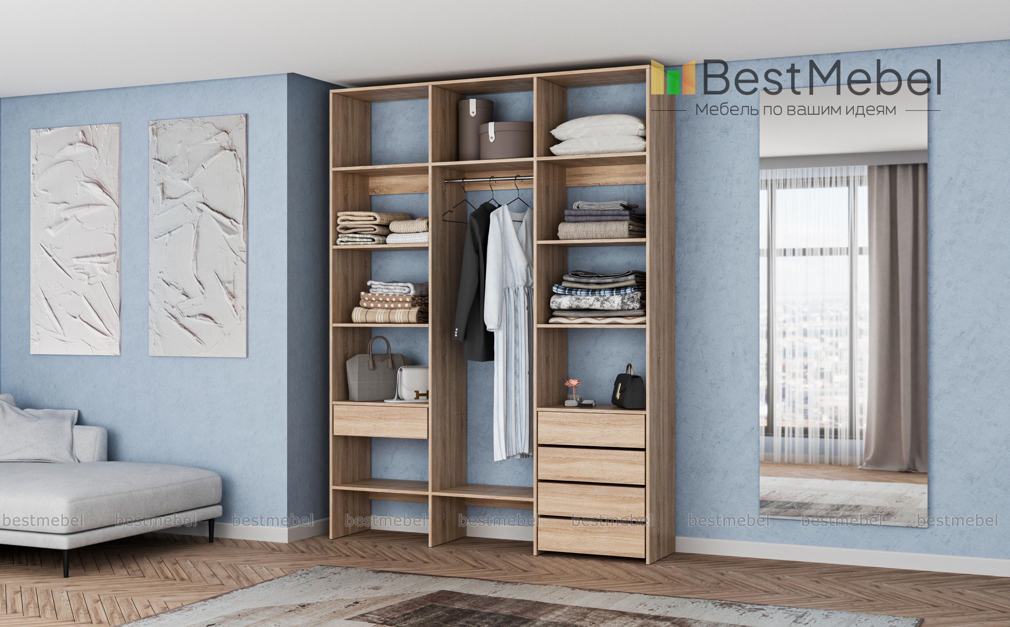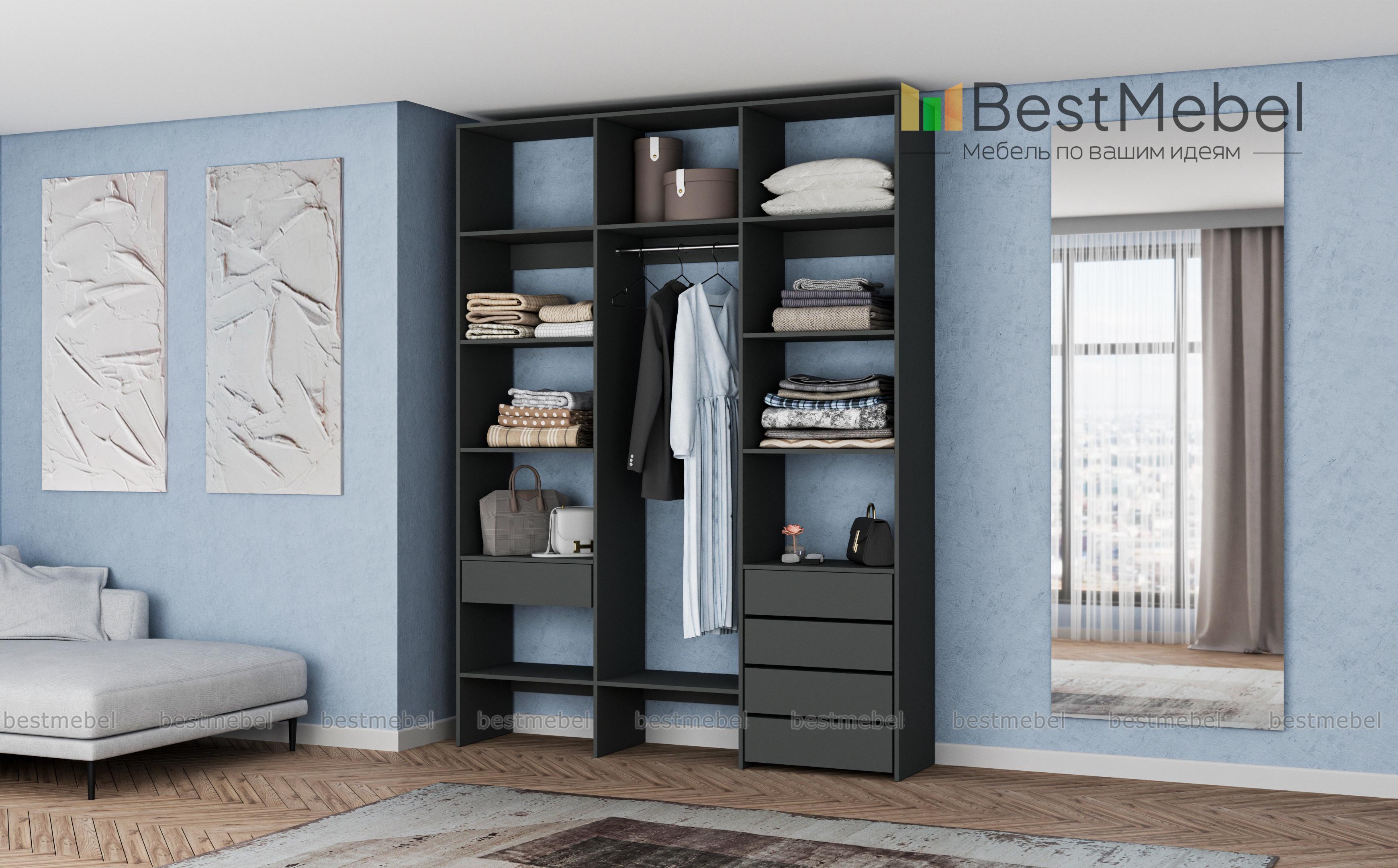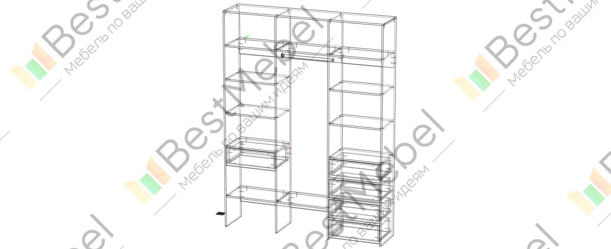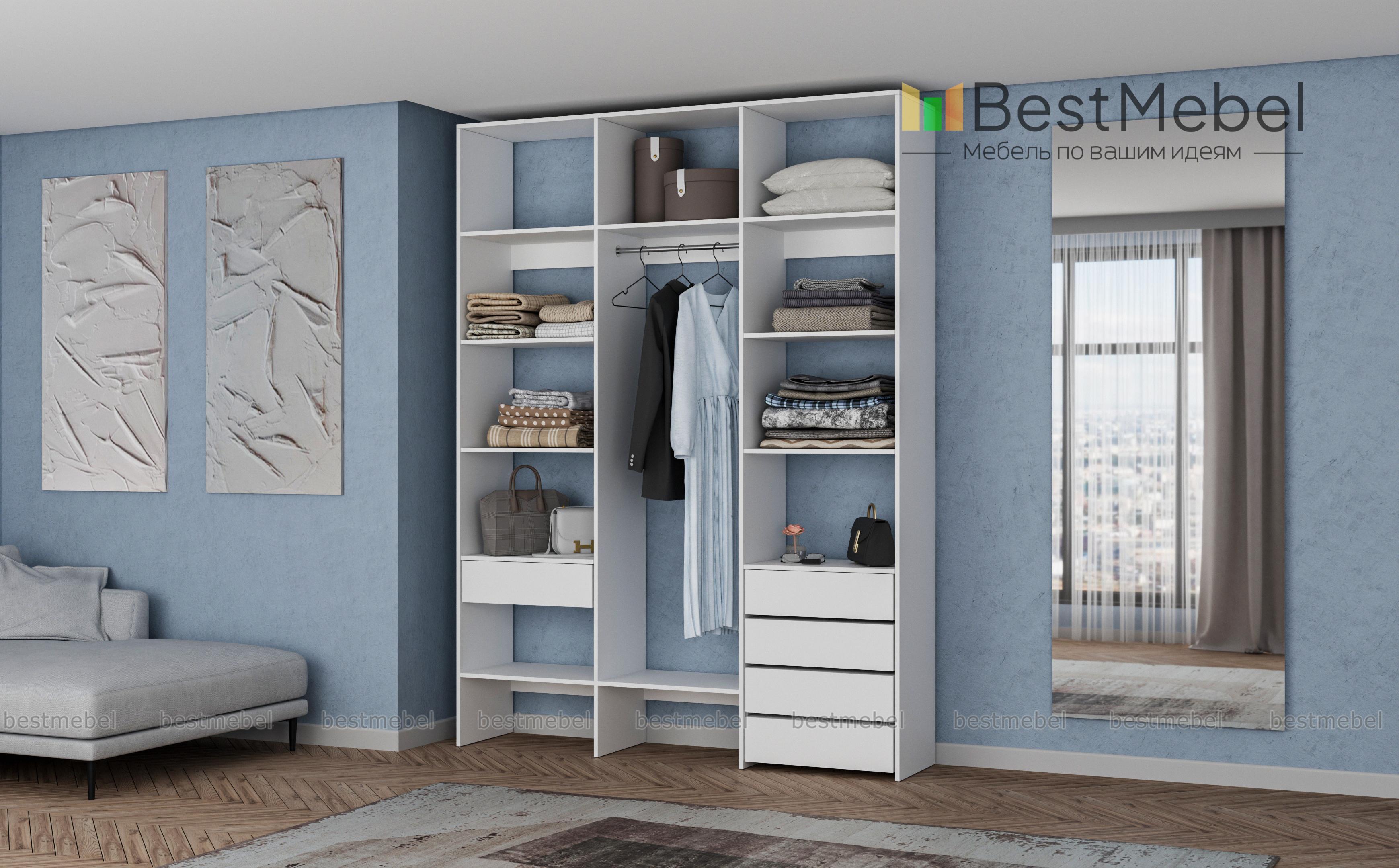 Стеллаж для одежды Мирта 10 BMS поможет легко поддерживать порядок в вашей прихожей, спальне или гардеробной. Все вещи будут на виду и под рукой благодаря продуманной системе открытых полок и выдвижных ящиков с платяной секцией в центре. Стеллаж выполнен из прочной ламинированной плиты, что гарантирует ему долгий срок службы и эстетичный вид. Купить стеллаж для одежды Мирта 10 BMS, изготовленный по индивидуальным размерам, вы сможете недорого в нашем интернет-магазине.