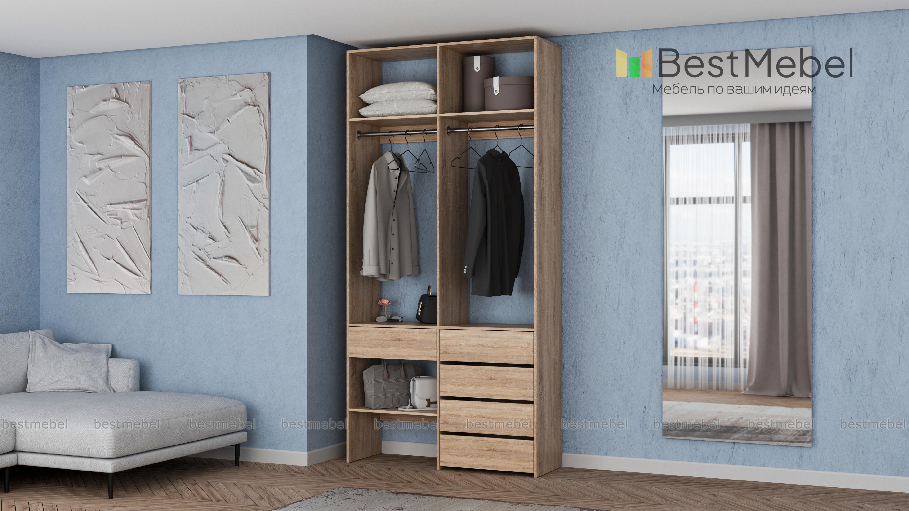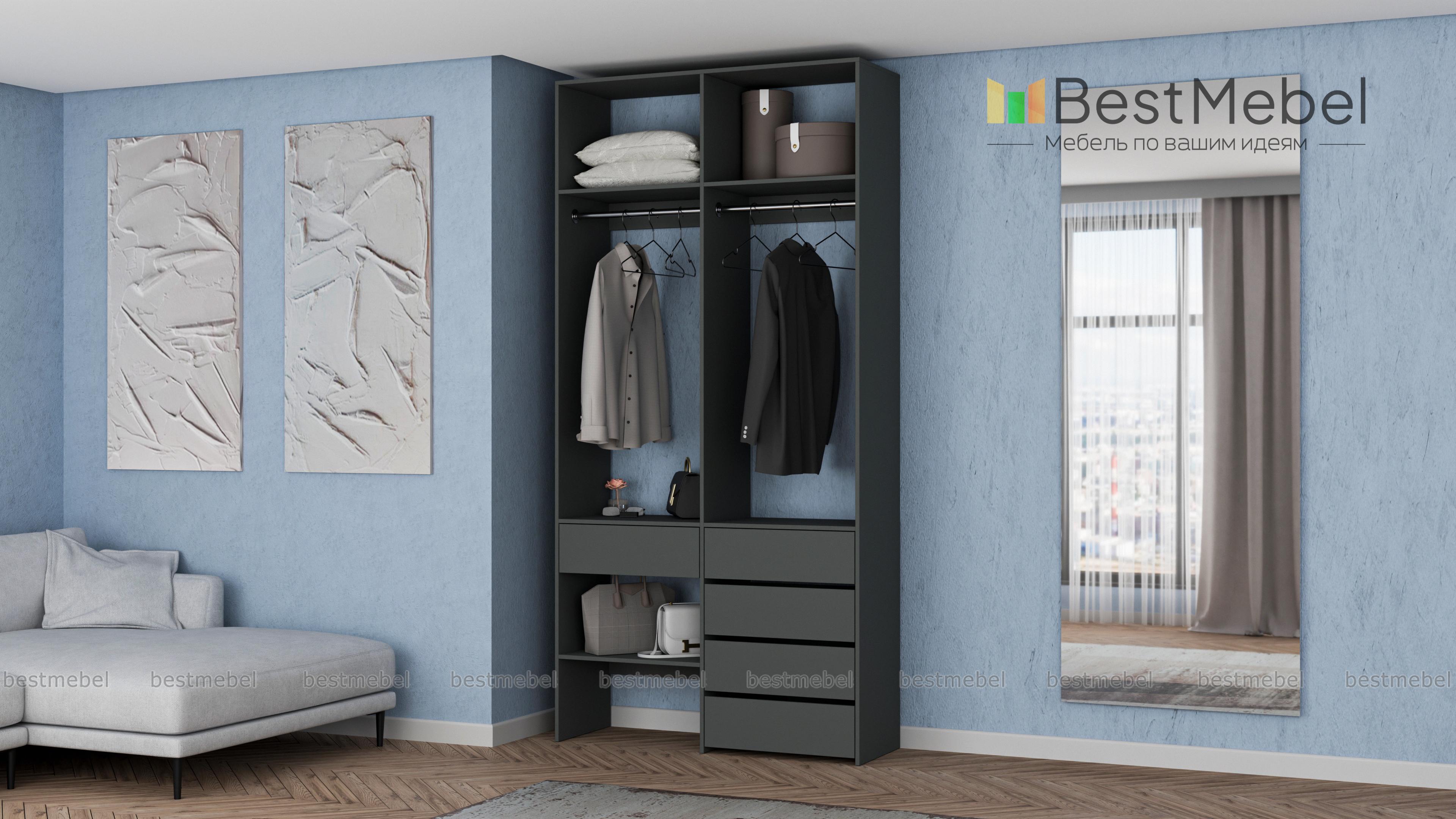 Стеллаж для одежды Мирта 46 BMS — стильный и функциональный, имеет удобную конфигурацию. Две штанги, полки на разной высоте и пять выдвижных ящиков максимально эффективно используют небольшое пространство. Двухсекционный стеллаж из прочной ламинированной ДСП прекрасно подходит для малогабаритных помещений, легко сохраняя порядок. Купить стеллаж для одежды Мирта 46 BMS в необходимом размере и любом оттенке из нашего каталога вы сможете на сайте интернет-магазина.