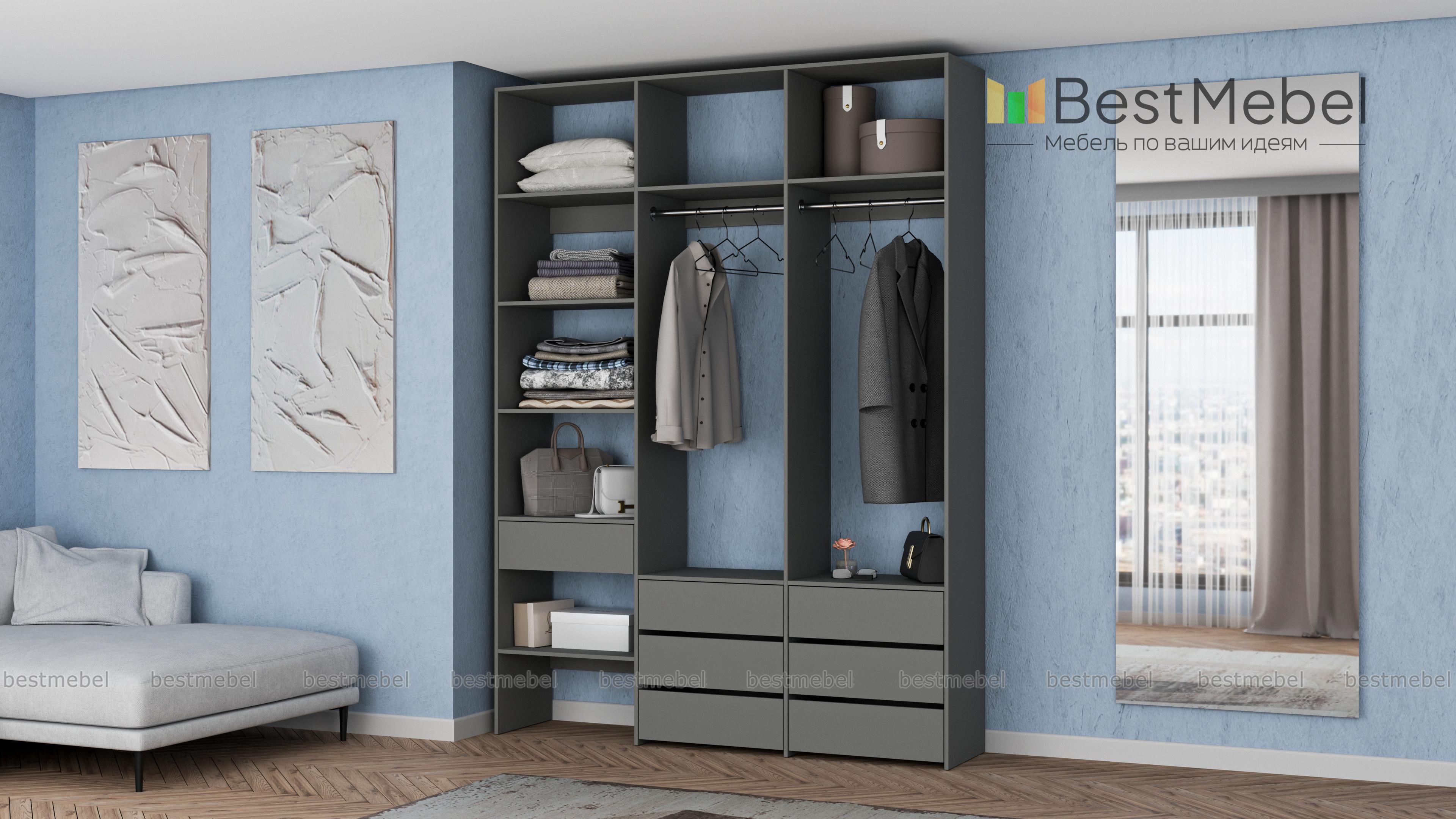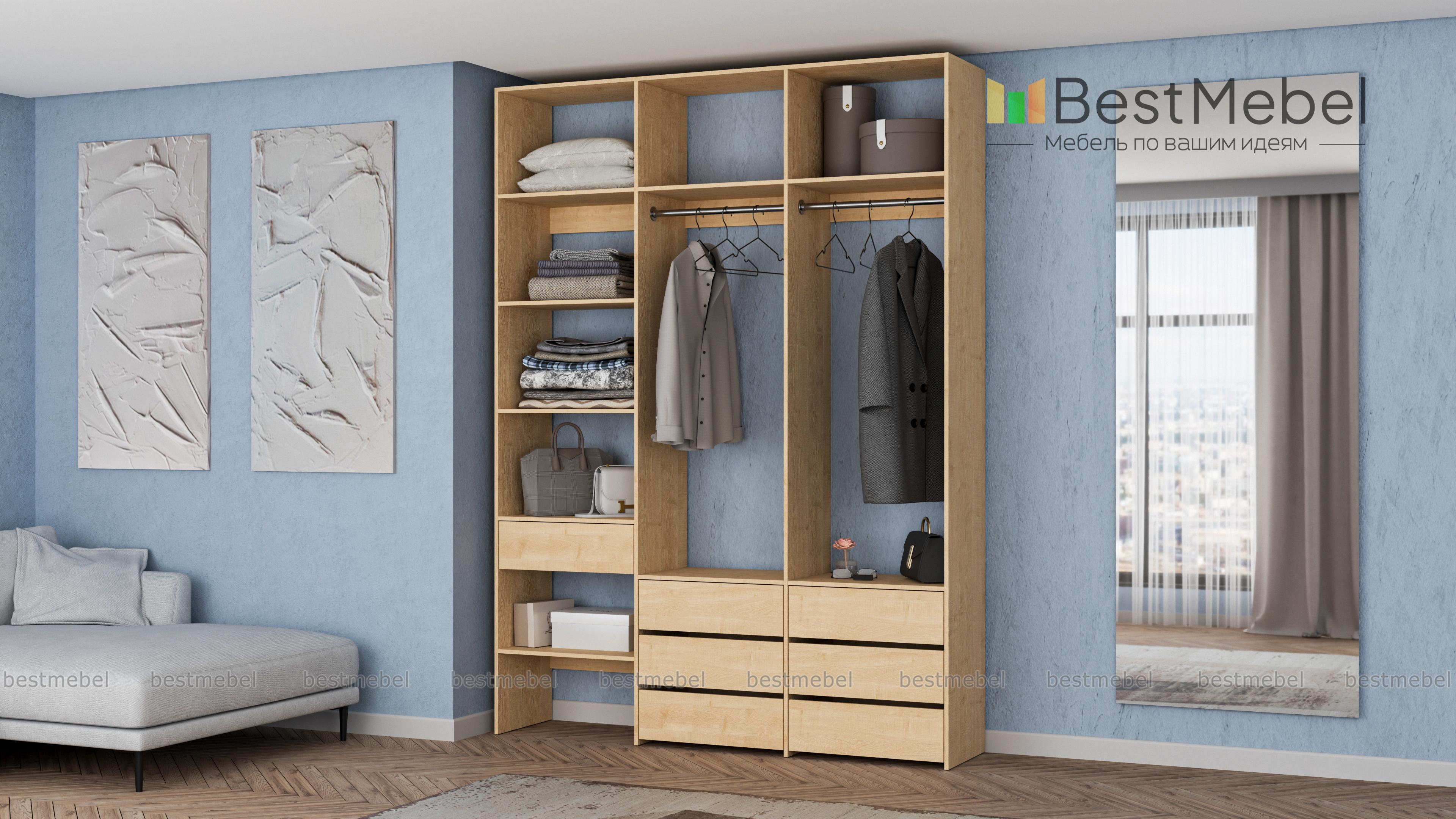 Стеллаж для одежды Мирта 52 BMS оборудован не только двумя штангами, но и расположенными на разных уровнях выдвижными ящиками и полками. Конструкция позволяет вам бережно разместить вещи на вешалках и трикотаж, коробки с обувью и корзины со всевозможными мелочами. Стеллаж выполнен из прочной ЛДСП, что обеспечивает ему долгий срок службы и эстетичный внешний вид. Купить стеллаж для одежды Мирта 52 BMS вы сможете в нашем интернет-магазине, подобрав размеры и цвет по каталогу.