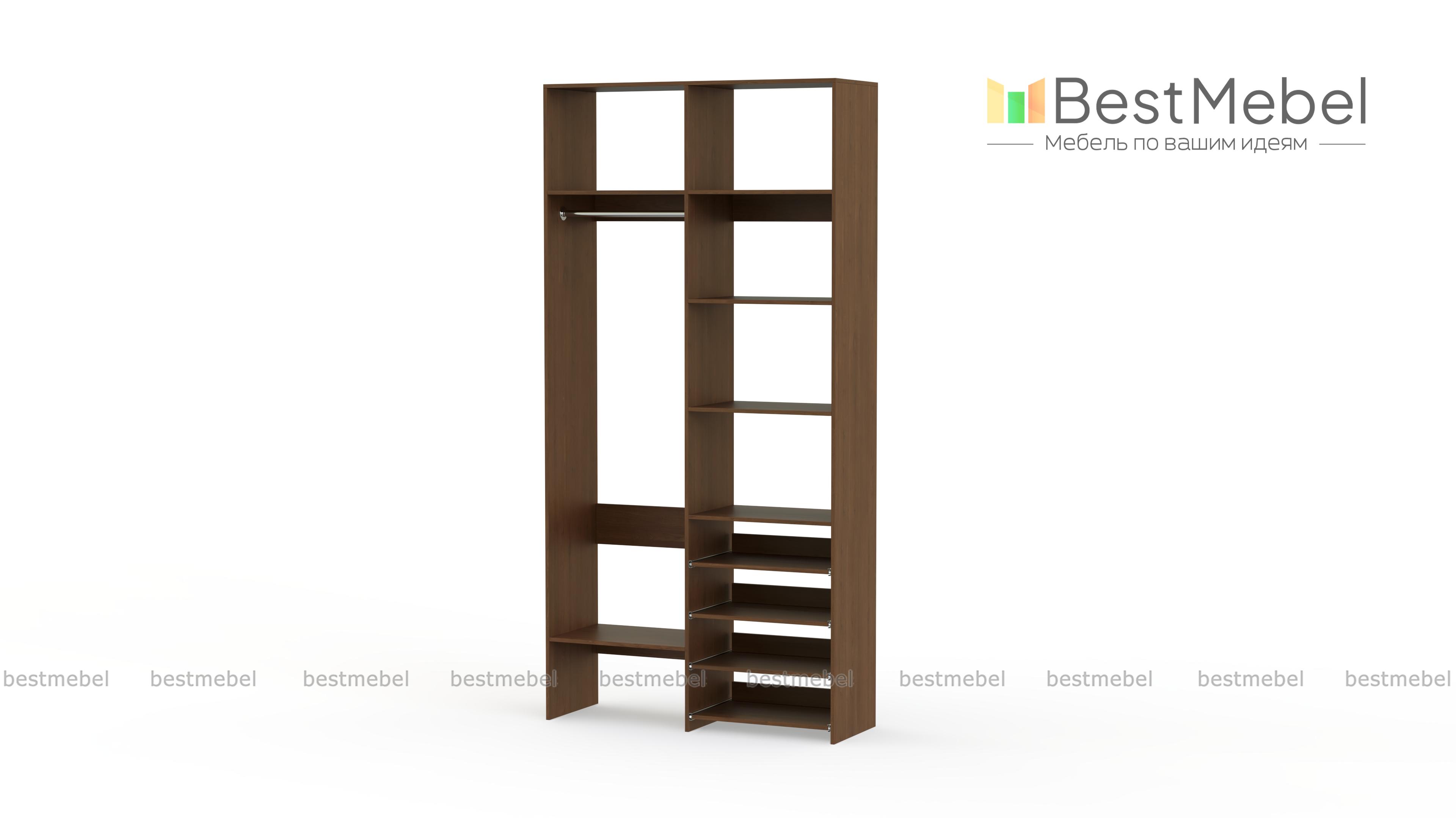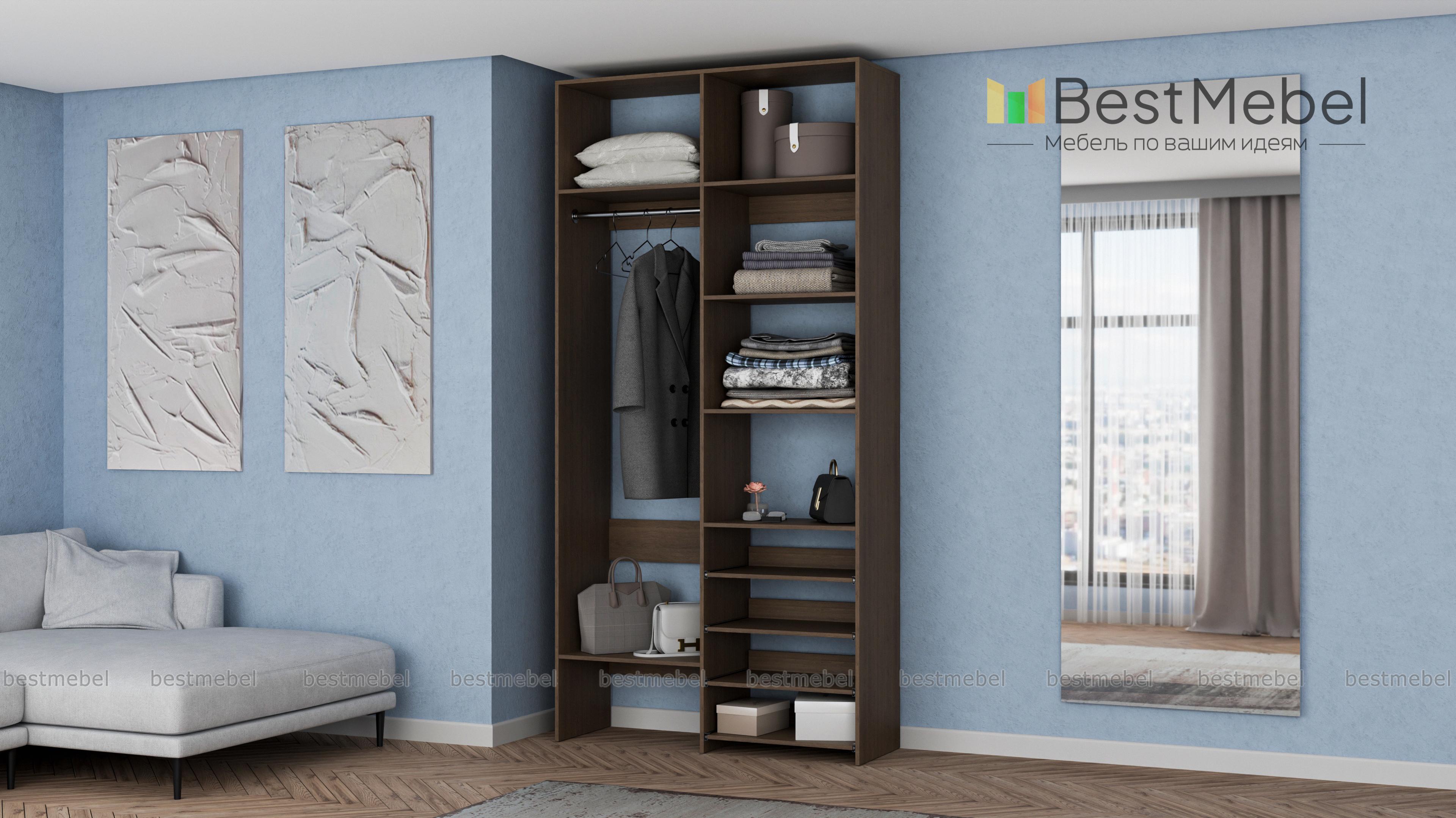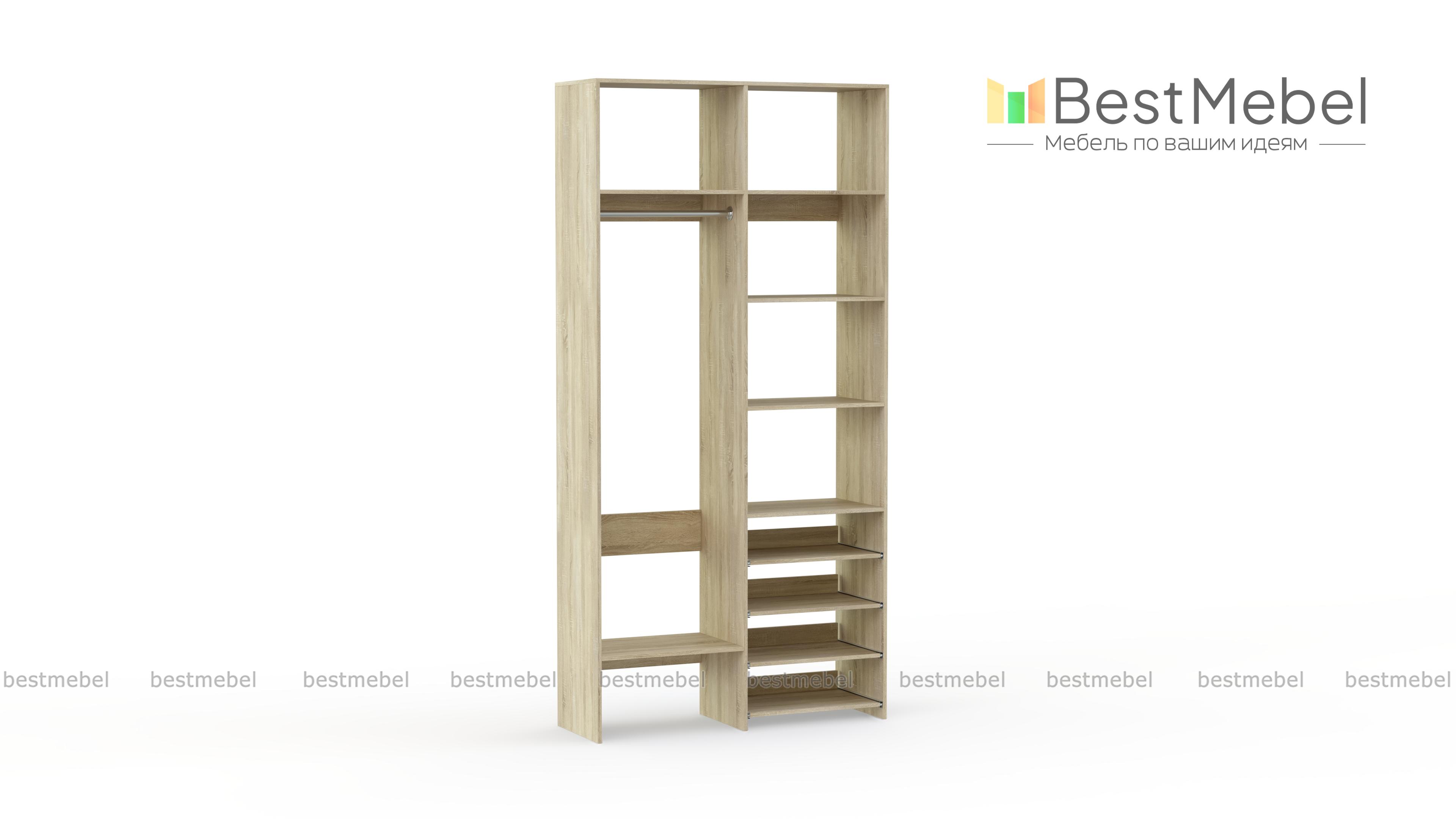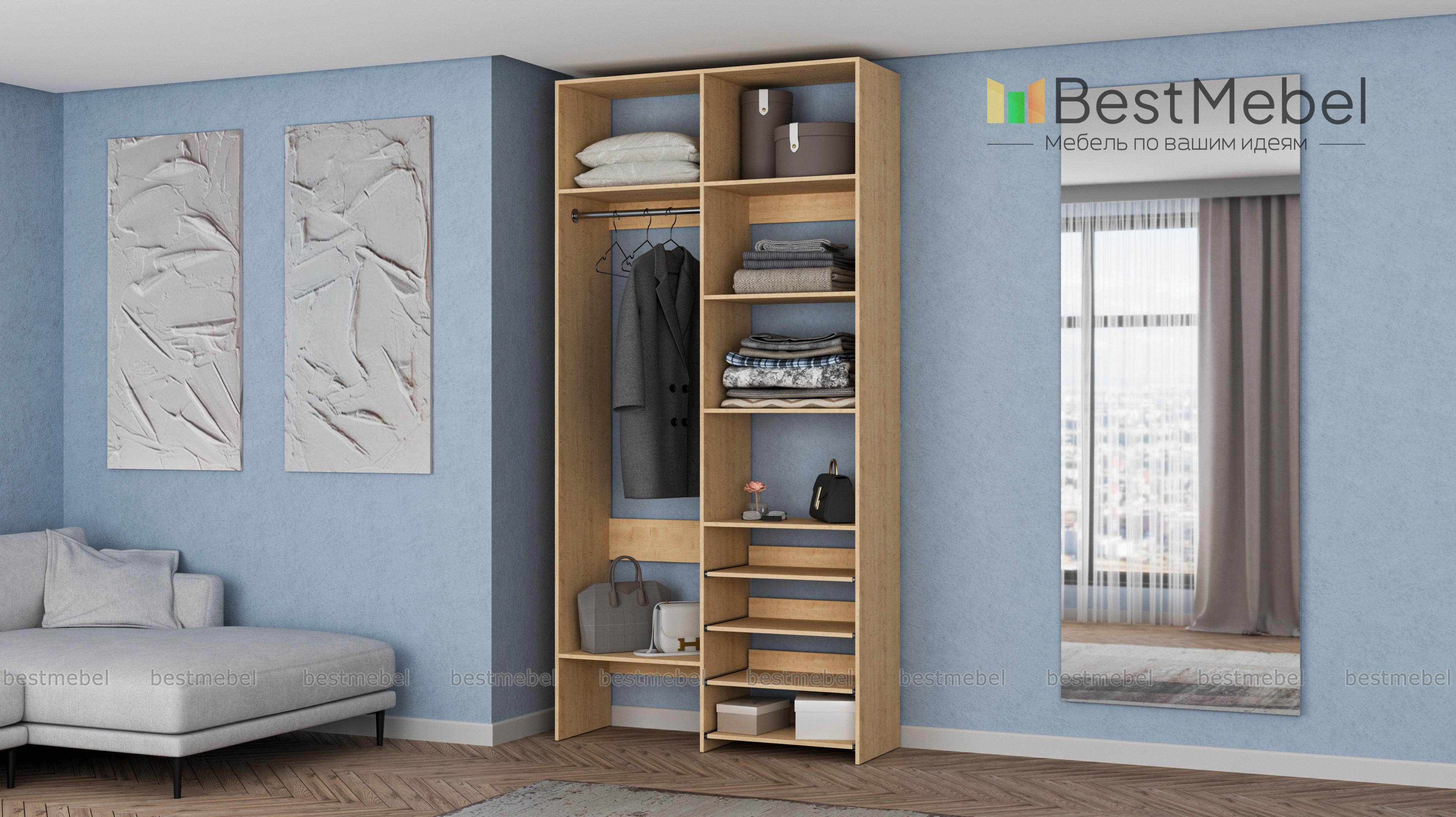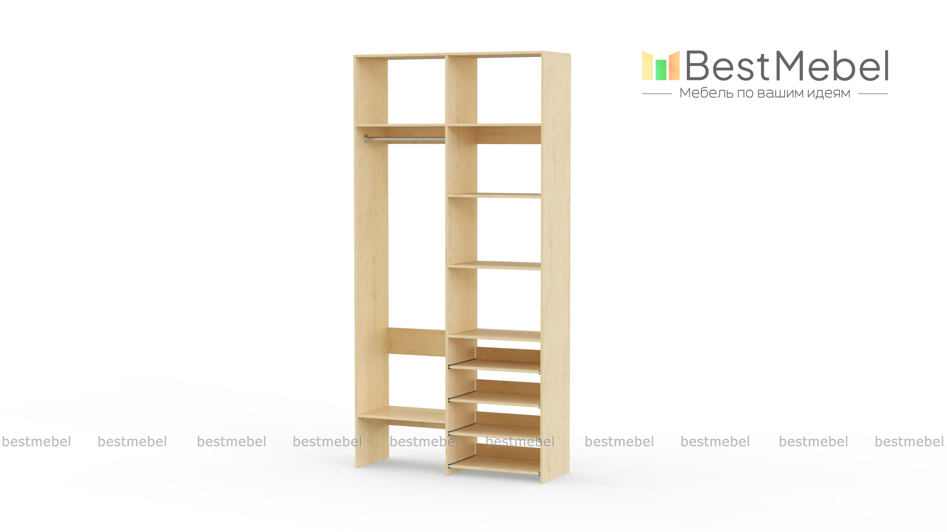 Стеллаж для одежды Мирта 79 BMS подойдет вам, если вещей немного. Компактная по ширине конструкция оборудована не только штангой для вешалок и стандартным набором бельевых полок, но и четырьмя выдвижными панелями. В нейтральном природном оттенке стеллаж выглядит современно, а простая форма хорошо вписывается в пространство. Купить стеллаж для одежды Мирта 79 BMS, изготовленный по индивидуальным размерам, вы всегда сможете на сайте нашего интернет-магазина.