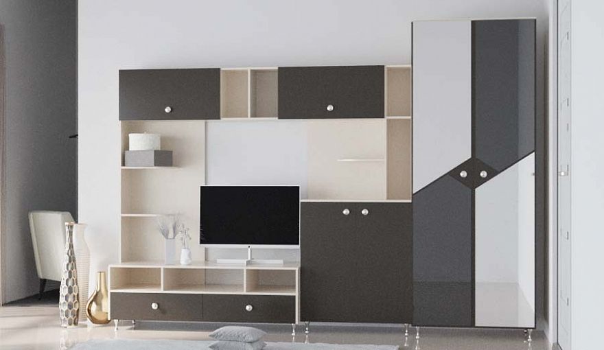Стенка Европа № 2 BMS представляет собой современный вариант горки, оптимальный для небольших гостиных. Визуально легкая модульная композиция включает в себя низкую тумбу под ТВ, глухие и открытые полки для бытовых мелочей, книг и предметов декора, а также распашной платяной шкаф. Стенка выполнена в теплой коричнево-бежевой гамме, фасад шкафа декорирован геометричными зеркальными вставками. Купить стенку Европа № 2 BMS и обустроить уютную и стильную зону отдыха вам поможет наш интернет-магазин.
