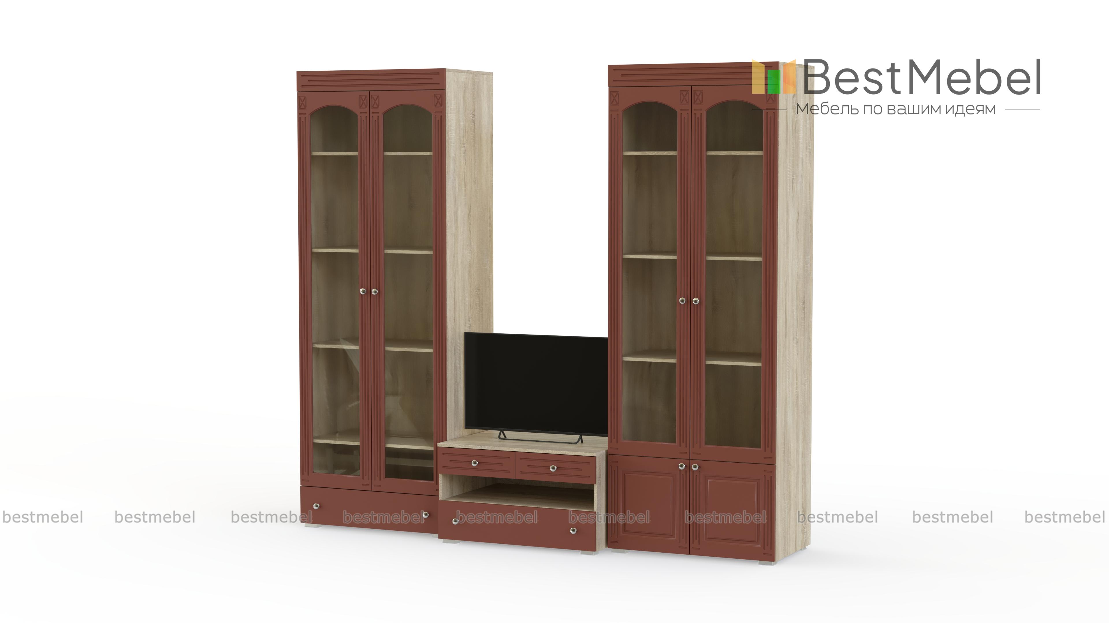 Стенка Маргарет BMS сочетает в себе практичность конструкции и элегантный дизайн в классическом стиле. Модульный набор для гостиной включает в себя широкую низкую тумбу под аппаратуру с выдвижными ящиками и нишей, вместительный платяной шкаф с ростовыми зеркалами на фасаде и две витрины. Выполненные в насыщенных темных тонах, предметы декорированы по фасаду фрезеровкой. Купить стенку Маргарет BMS для уютного и респектабельного интерьера приглашаем в наш интернет-магазин.