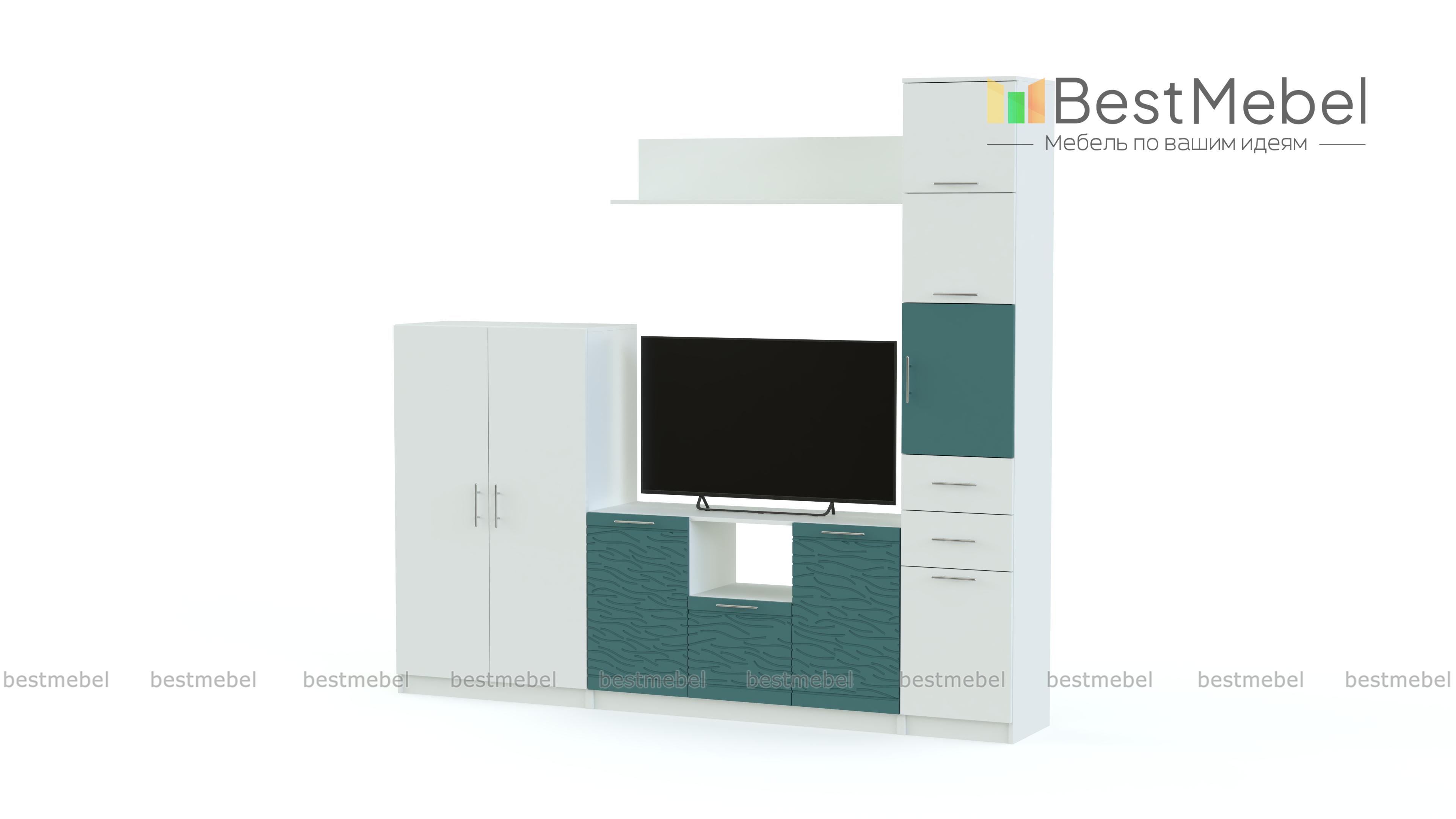 Стенка Вельвет 4 BMS – модульная композиция для светлого и визуально легкого современного интерьера. Поклонникам минимализма придутся по душе простота формы и высокая функциональность. Комплект оборудован высокой комбинированной колонкой, вместительной тумбой под ТВ, распашным комодом и навесной открытой полкой. Особенно эффектный вид стенке придают разноуровневость и сочетание древесных тонов с темными фасадами, декорированными рельефным рисунком. Купить стенку Вельвет 4 BMS, стильную и надежную, вам поможет наш интернет-магазин.