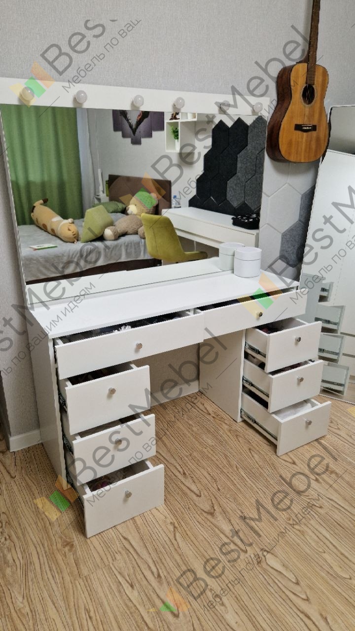 Туалетный столик Лацио 5 BMS выполнен в белоснежном глянце и отличается эффектным минимализмом. Практичная современная модель обеспечит комфортный уход за собой и разместит в зоне быстрого доступа все необходимые мелочи. Оптимальный для нанесения макияжа, столик оборудован широкой столешницей, под которой располагаются выдвижные ящики разных размеров, и большим зеркалом с лампочками. Купить туалетный столик Лацио 5 BMS вы сможете в нашем интернет-магазине по лучшей цене.