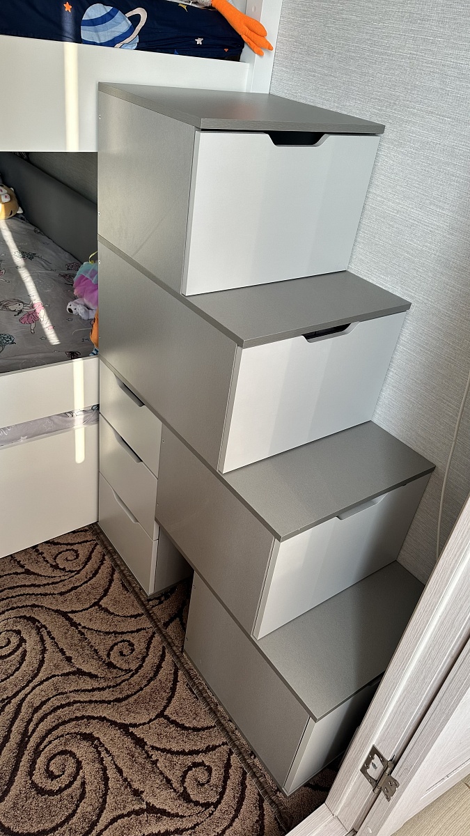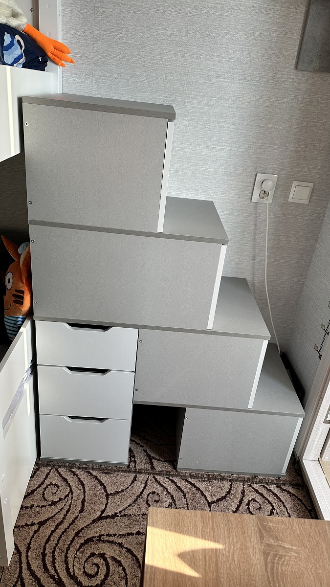 Очень красивая, удобная и вместительная лестница. Пришла очень быстро. Собирается не очень легко, из-за большого количества ящиков, но зато много мест для хранения.