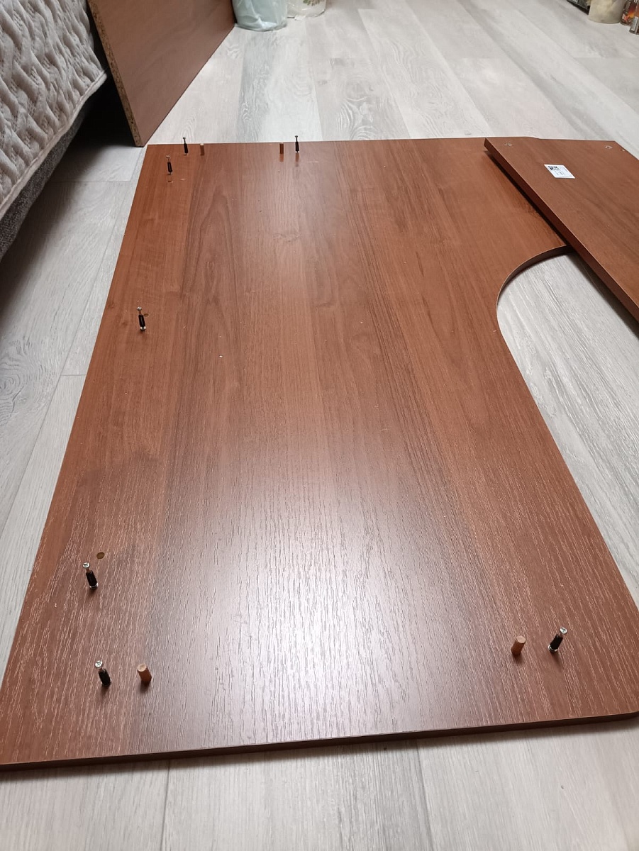 Стол очень красивый, удобный и вместительный.Заказывал нестандартные размеры - все вырезали как надо(на фото - Ш x Г x В - 1350мм x 950мм x 750мм, глубина от "выреза для пуза" до противолежащего угла - 873мм).Неспешная сборка заняла 15 минут. Все было аккуратно упаковано. Инструкция по сборке весьма минималистична, но все итак интуитивно понятно, все намечено-насверлено.По покрытию - цвет "Бетон пайн экзотик" хоть и очень красивый, но сильно отличается от превью на сайте - на сайте он намного темнее. Само покрытие рельефное, тактильно приятное.Кромка - вот тут я что-то ступил и взял стандартную кромку - 0.4мм. Советую все же заказать побольше - уж больно "острые" края стола, как будто порезаться можно, для себя решил эту проблему за 5 минут шкуркой P800.Итого - хороший стол, удобное рабочее место.