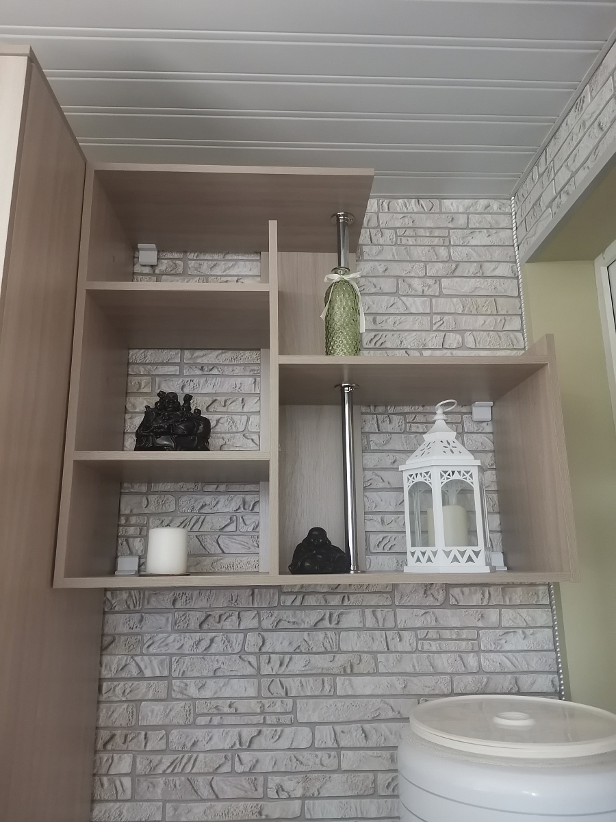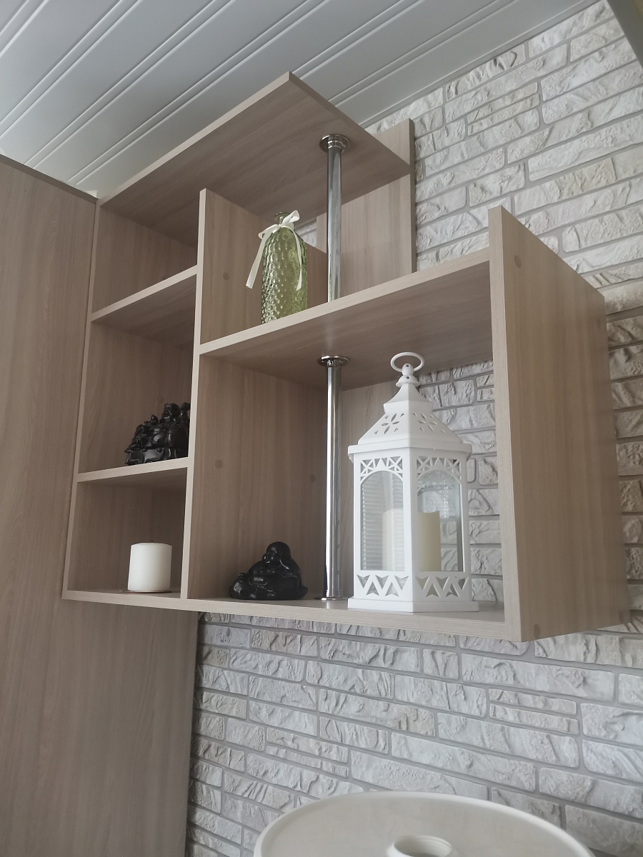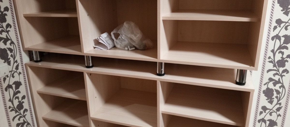 Полка Оскар 6. Приобрел сразу две, планировал использовать по прямому назначению - под книги. После сборки понравилось всё... кроме веса. Очень тяжелая, поэтому не рискнул повесить на стену (межкомнатная перегородка). Долго думал и решил немного "сколхозить" - нижнюю полку  установил на мебельных ножках высотой 20 см, верхнюю взгромоздил на ножках 10 см. , результат на фотографиях. Стёкла ещё не установил.   В целом, впечатление от полки хорошее. Но имейте в виду - вес у нее солидный.