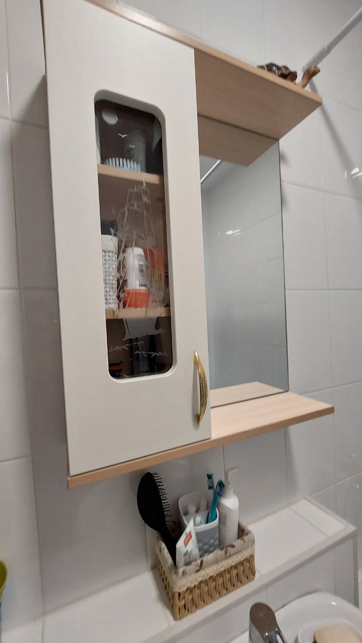 Очень хорошее, удобное зеркало. Единственное: мы заказали рисунок на стекло и казалось, что само стекло будет матовое, а на нём рисунок, а оказалось, что стекло прозрачное, поэтому видно все, что стоит на полках. Но в принципе это не критично, поэтому не стали ничего менять.