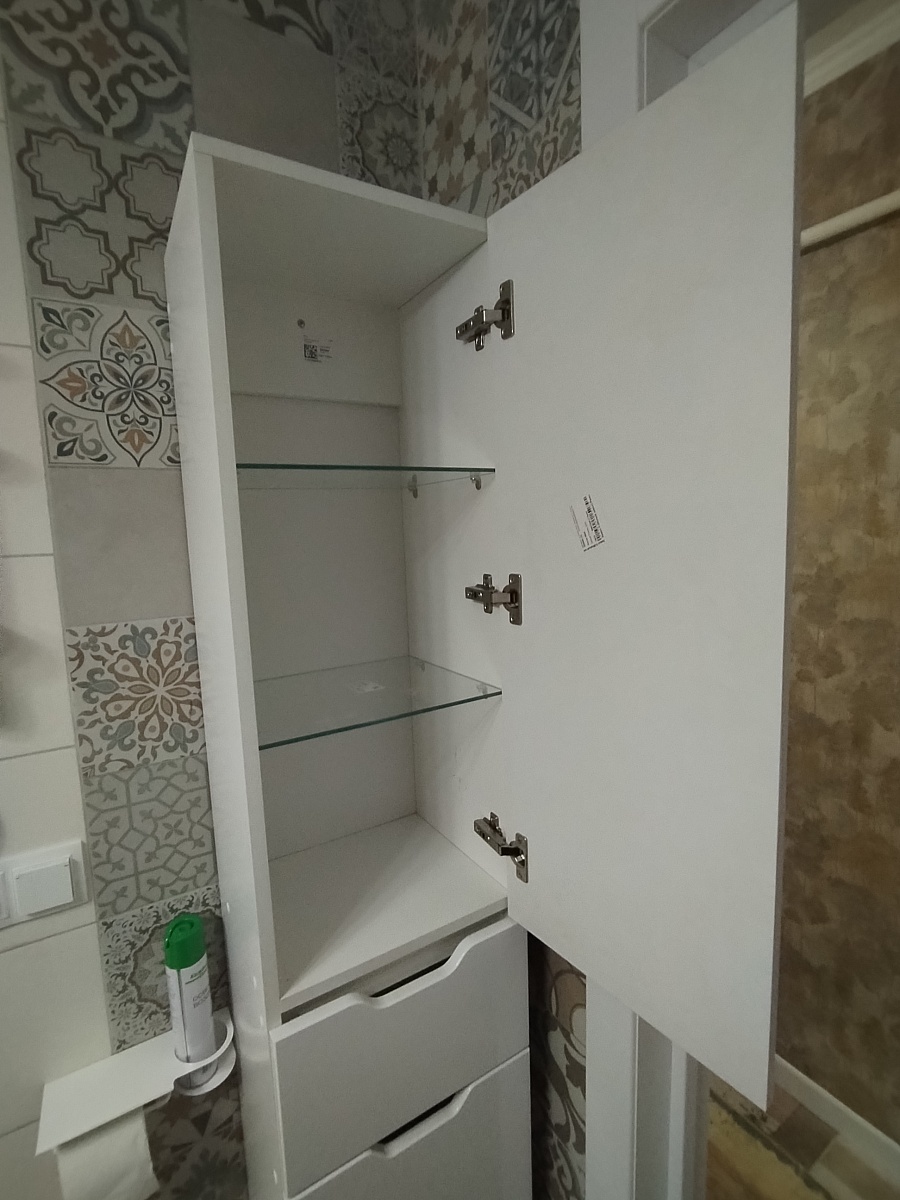 Прекрасный шкаф. Сделали точно по оговоренным размерам. Выполнили просьбу о стеклянных полках!  Жаль, что изначально не предусмотрена корзина для белья, но удалось купить подходящую по размеру и вставить в нижнюю часть шкафа. При доставке проверили целостность компонентов и стекла. Сборка проблем не вызвала.