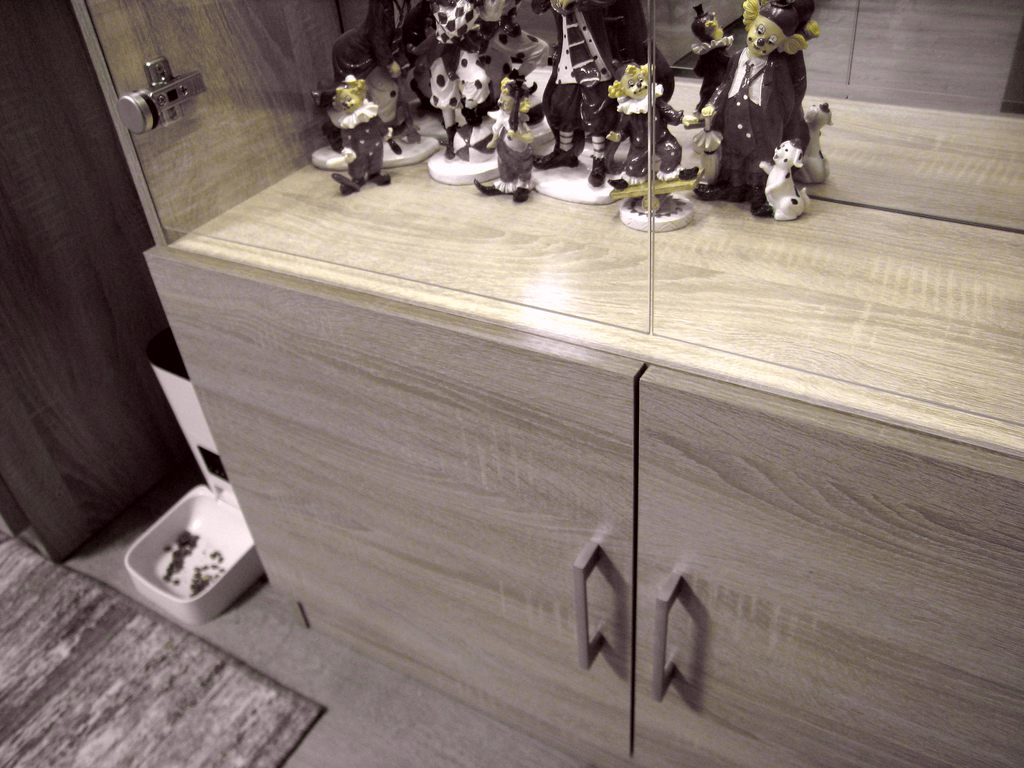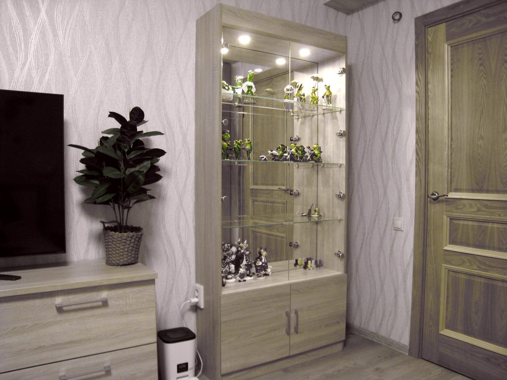 Заказ 00000989846, торговый стеллаж Кассиопея 2 BMS.Жене домой нужен был удобный вместительный стеллаж (витрина) со стеклами и зеркалом для собирающейся коллекции лягух и клованов.Выбрал этот, в моих размерах 2000х900х280, без замков.В итоге собственной сборки получилось то, что надо. Но, увы, не без танцев с бубном.Стеллаж очень тяжелый (зеркало + задняя стенка мебельный щит).Стекла, особенно тонкие дверцы с отверстиями под петли, приехали целыми. А на них даже дышать страшно...Стеклянные дверцы устанавливаются, как вкладные, снизу получается щель где-то 2 см, если не часто, то открывать удобно, и стекла не пачкаются.Подрезано всё отлично, никаких проблем.Освещения, идущего в комплекте, вполне достаточно.Минусы:На некоторых панелях кромка может выступать за геометрию на 1 - 1, 5 мм, приходится подрезать.Петель на нижние дверцы в наборе не оказалось, только 4 ответки. Поставил свои.Для петель на стеклянные дверцы стекло 3мм слишком тонкое, пришлось купить резиновые кольца (из автонабора колец, по 3р.), и взять более длинные саморезы для затяжки петли на стекле.Докупил А-образный силиконовый профиль (можно разрезанную трубку)  на торцы полок, иначе дверцы просто побьются.Зеркало испачкано чем-то белесым, что даже растворителем не оттирается до конца.В комплекте черный провод 220v... И что им делать? Ни одной выборки под провод, чтобы как-то незаметно опустить его хотя бы в нижнее отделение стеллажа, в конструкции не предусмотрено. Подсверлил, поставил тонкий прозрачный, врезал удобный микровыключатель.В целом всё устроило, но повозиться пришлось изрядно.